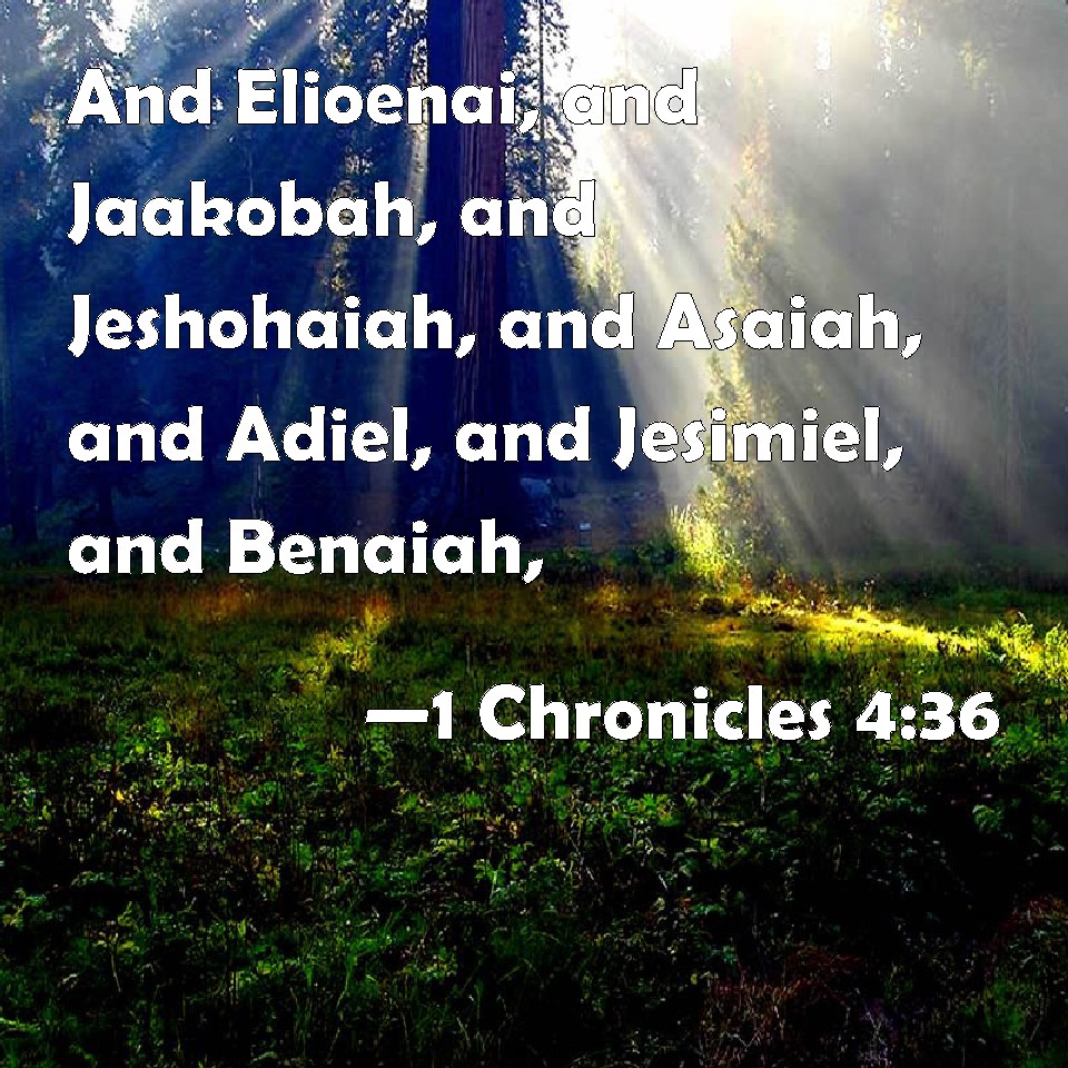 Choose a Background 1 Chronicles 4:36 And Elioenai, and Jaakobah, and Jeshohaiah, and Asaiah, and Adiel, and Jesimiel, and Benaiah, KJV: And Elioenai, and Jaakobah, and Jeshohaiah, and Asaiah, and Adiel, and Jesimiel, and Benaiah, DRB: And Elioenai, and Jacoba, and Isuhaia, and Asaia, and Adiel, and Ismiel, and Banaia, DBT: and Elioenai, and Jaakobah, and Jeshohaiah, and Asaiah, and Adiel, and Jesimiel, and Benaiah, ERV: and Elioenai, and Jaakobah, and Jeshohaiah, and Asaiah, and Adiel, and Jesimiel, and Benaiah; WBT: And Elioenai, and Jaakobah, and Jeshohaiah, and Asaiah, and Adiel, and Jesimiel, and Benaiah, WEB: and Elioenai, and Jaakobah, and Jeshohaiah, and Asaiah, and Adiel, and Jesimiel, and Benaiah, YLT: and Elioenai, and Jaakobah, and Jeshohaiah, and Asaiah, and Adiel, and Jesimiel, and Benaiah,Links 1 Chronicles 4:36 NIV • 1 Chronicles 4:36 NLT • 1 Chronicles 4:36 ESV • 1 Chronicles 4:36 NASB • 1 Chronicles 4:36 KJV • 1 Chronicles 4:36 Interlinear • 1 Chronicles 4:36 Commentaries • 1 Chronicles 4:36 Parallel Texts • 1 Chronicles 4:36 Bible Apps • 1 Chronicles 4:36 Parallel • Bible Hub |