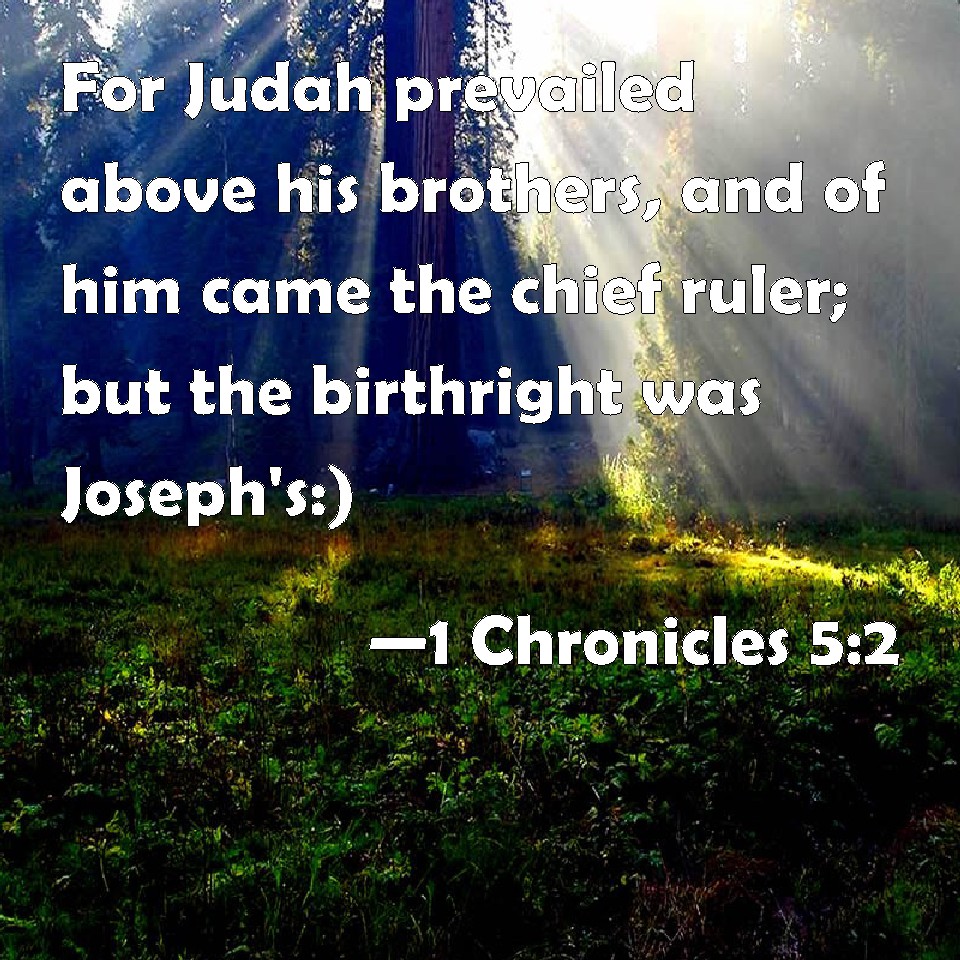 Choose a Background 1 Chronicles 5:2 For Judah prevailed above his brothers, and of him came the chief ruler; but the birthright was Joseph's:) KJV: For Judah prevailed above his brethren, and of him came the chief ruler; but the birthright was Joseph's:) DRB: But of the race of Juda, who was the strongest among his brethren, came the princes: but the first birthright was accounted to Joseph.) DBT: for Judah prevailed among his brethren, and of him was the prince, but the birthright was Joseph's), ERV: For Judah prevailed above his brethren, and of him came the prince; but the birthright was Joseph's:) WBT: For Judah prevailed above his brethren, and of him came the chief ruler; but the birth-right was Joseph's:) WEB: For Judah prevailed above his brothers, and of him came the prince; but the birthright was Joseph's:) YLT: for Judah hath been mighty over his brother, and for leader above him, and the birthright is to Joseph.Links 1 Chronicles 5:2 NIV • 1 Chronicles 5:2 NLT • 1 Chronicles 5:2 ESV • 1 Chronicles 5:2 NASB • 1 Chronicles 5:2 KJV • 1 Chronicles 5:2 Interlinear • 1 Chronicles 5:2 Commentaries • 1 Chronicles 5:2 Parallel Texts • 1 Chronicles 5:2 Bible Apps • 1 Chronicles 5:2 Parallel • Bible Hub |