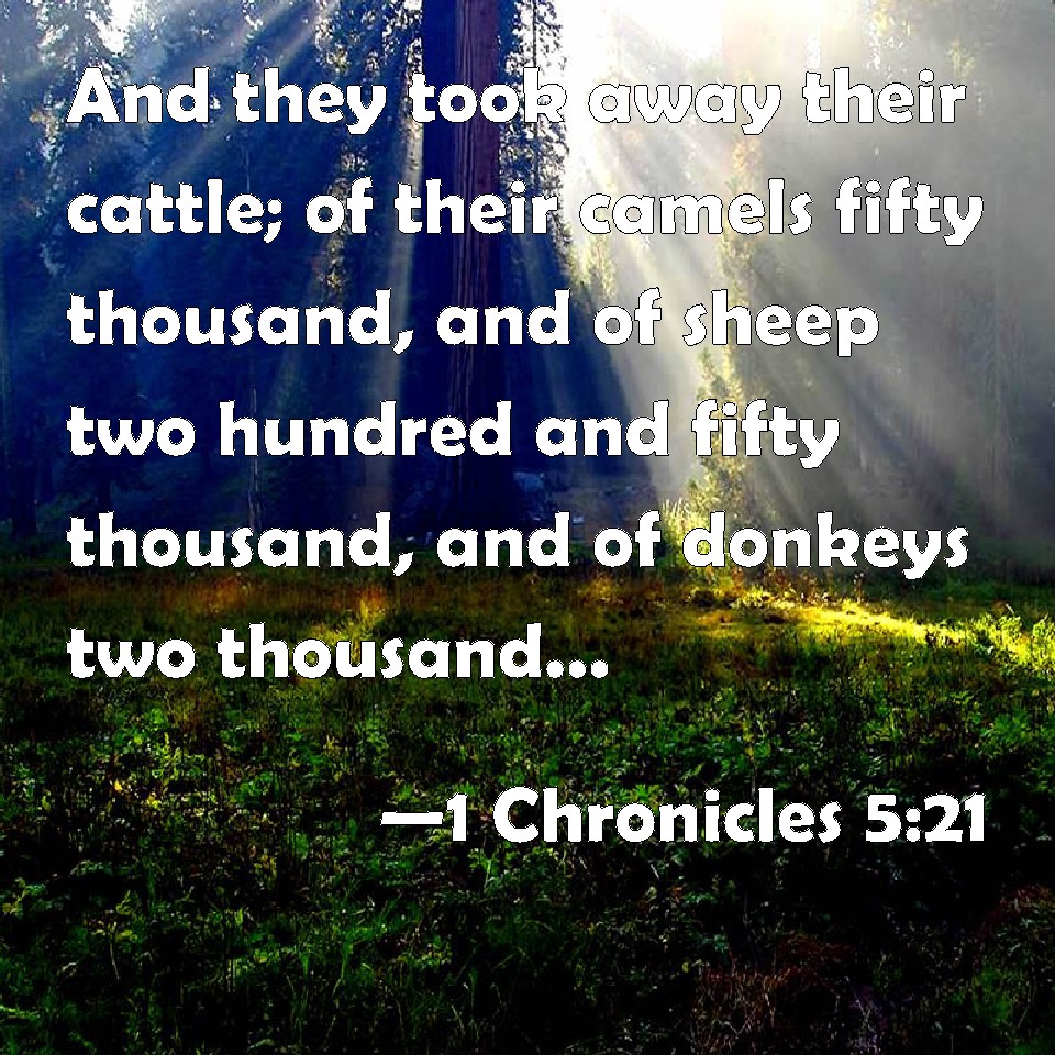 Choose a Background 1 Chronicles 5:21 And they took away their cattle; of their camels fifty thousand, and of sheep two hundred and fifty thousand, and of asses two thousand, and of men an hundred thousand. KJV: And they took away their cattle; of their camels fifty thousand, and of sheep two hundred and fifty thousand, and of asses two thousand, and of men an hundred thousand. DRB: And they took all that they possessed, of camels fifty thousand, and of sheep two hundred and fifty thousand, and of asses two thousand, and of men a hundred thousand souls. DBT: And they took away their cattle: their camels fifty thousand, and two hundred and fifty thousand sheep, and two thousand asses, and a hundred thousand human souls. ERV: And they took away their cattle; of their camels fifty thousand, and of sheep two hundred and fifty thousand, and of asses two thousand, and of men an hundred thousand. WBT: And they took away their cattle; of their camels fifty thousand, and of sheep two hundred and fifty thousand, and of asses two thousand, and of men a hundred thousand. WEB: They took away their livestock; of their camels fifty thousand, and of sheep two hundred fifty thousand, and of donkeys two thousand, and of men one hundred thousand. YLT: And they take captive their cattle, of their camels fifty thousand, and of sheep two hundred and fifty thousand, and of asses two thousand, and of human beings a hundred thousand;Links 1 Chronicles 5:21 NIV • 1 Chronicles 5:21 NLT • 1 Chronicles 5:21 ESV • 1 Chronicles 5:21 NASB • 1 Chronicles 5:21 KJV • 1 Chronicles 5:21 Interlinear • 1 Chronicles 5:21 Commentaries • 1 Chronicles 5:21 Parallel Texts • 1 Chronicles 5:21 Bible Apps • 1 Chronicles 5:21 Parallel • Bible Hub |
