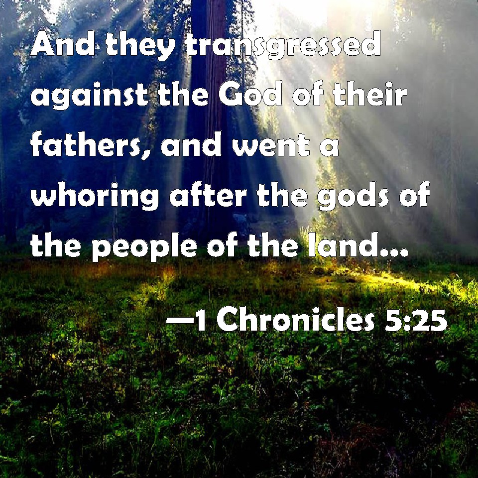 Choose a Background 1 Chronicles 5:25 And they transgressed against the God of their fathers, and went a whoring after the gods of the people of the land, whom God destroyed before them. KJV: And they transgressed against the God of their fathers, and went a whoring after the gods of the people of the land, whom God destroyed before them. DRB: But they forsook the God of their fathers, and went astray after the gods of the people of the land, whom God destroyed before them. DBT: And they transgressed against the God of their fathers, and went a whoring after the gods of the peoples of the land, whom God had destroyed before them. ERV: And they trespassed against the God of their fathers, and went a whoring after the gods of the peoples of the land, whom God destroyed before them. WBT: And they transgressed against the God of their fathers, and went astray after the gods of the people of the land, whom God destroyed before them. WEB: They trespassed against the God of their fathers, and played the prostitute after the gods of the peoples of the land, whom God destroyed before them. YLT: And they trespass against the God of their fathers, and go a-whoring after the gods of the peoples of the land whom God destroyed from their presence;Links 1 Chronicles 5:25 NIV • 1 Chronicles 5:25 NLT • 1 Chronicles 5:25 ESV • 1 Chronicles 5:25 NASB • 1 Chronicles 5:25 KJV • 1 Chronicles 5:25 Interlinear • 1 Chronicles 5:25 Commentaries • 1 Chronicles 5:25 Parallel Texts • 1 Chronicles 5:25 Bible Apps • 1 Chronicles 5:25 Parallel • Bible Hub |