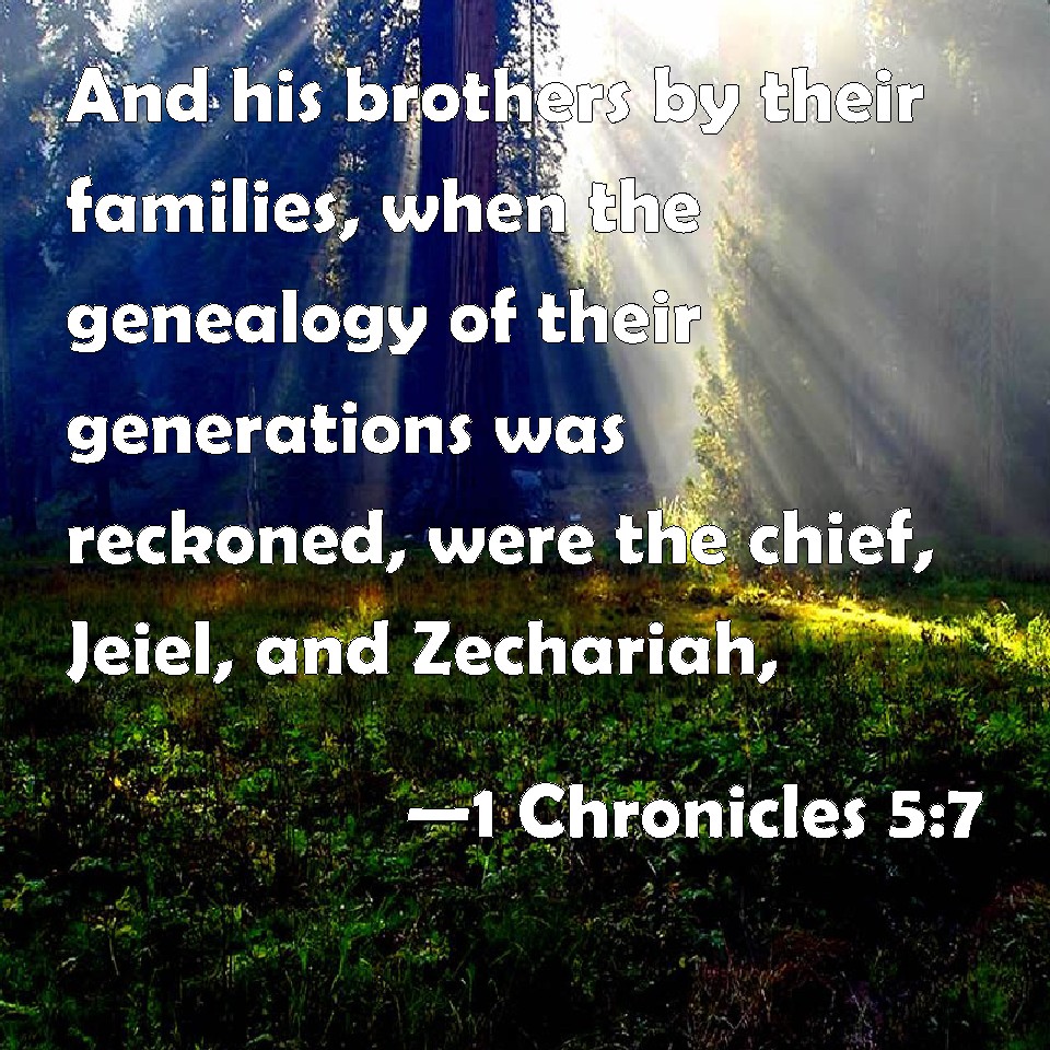 Choose a Background 1 Chronicles 5:7 And his brothers by their families, when the genealogy of their generations was reckoned, were the chief, Jeiel, and Zechariah, KJV: And his brethren by their families, when the genealogy of their generations was reckoned, were the chief, Jeiel, and Zechariah, DRB: And his brethren, and all his kindred, when they were numbered by their families, had for princes Jehiel, and Zacharias. DBT: And his brethren by their families, in the genealogical register of their generations, were: the chief, Jeiel, and Zechariah, ERV: And his brethren by their families, when the genealogy of their generations was reckoned; the chief, Jeiel, and Zechariah, WBT: And his brethren by their families, when the genealogy of their generations was reckoned, were the chief, Jeiel, and Zechariah, WEB: His brothers by their families, when the genealogy of their generations was reckoned: the chief, Jeiel, and Zechariah, YLT: And his brethren, by their families, in the genealogy of their generations, are heads: Jeiel, and Zechariah,Links 1 Chronicles 5:7 NIV • 1 Chronicles 5:7 NLT • 1 Chronicles 5:7 ESV • 1 Chronicles 5:7 NASB • 1 Chronicles 5:7 KJV • 1 Chronicles 5:7 Interlinear • 1 Chronicles 5:7 Commentaries • 1 Chronicles 5:7 Parallel Texts • 1 Chronicles 5:7 Bible Apps • 1 Chronicles 5:7 Parallel • Bible Hub |