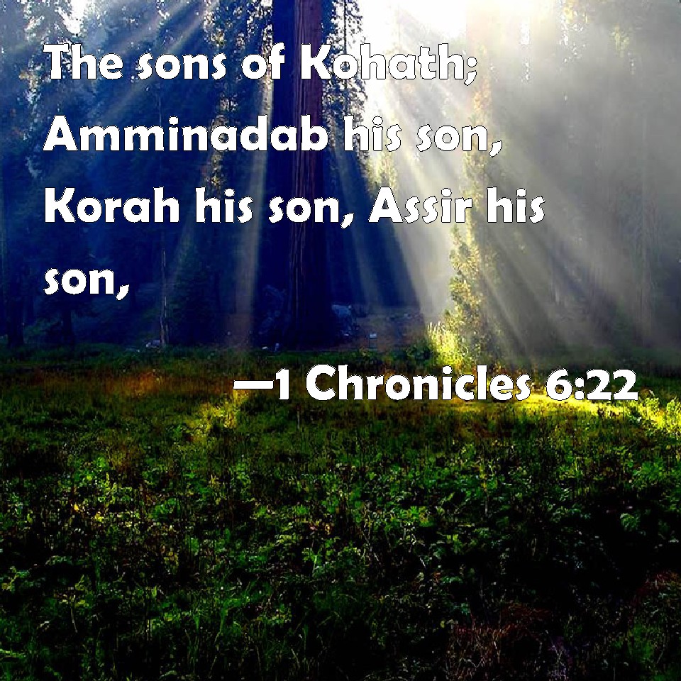 Choose a Background 1 Chronicles 6:22 The sons of Kohath; Amminadab his son, Korah his son, Assir his son, KJV: The sons of Kohath; Amminadab his son, Korah his son, Assir his son, DRB: The sons of Caath, Aminadab his son, Core his son, Asir his son, DBT: The sons of Kohath: Amminadab his son, Korah his son, Assir his son, ERV: The sons of Kohath; Amminadab his son, Koran his son, Assir his son; WBT: The sons of Kohath; Amminadab his son, Korah his son, Assir his son, WEB: The sons of Kohath: Amminadab his son, Korah his son, Assir his son, YLT: Sons of Kohath: Amminadab his son, Korah his son, Assir his son,Links 1 Chronicles 6:22 NIV • 1 Chronicles 6:22 NLT • 1 Chronicles 6:22 ESV • 1 Chronicles 6:22 NASB • 1 Chronicles 6:22 KJV • 1 Chronicles 6:22 Interlinear • 1 Chronicles 6:22 Commentaries • 1 Chronicles 6:22 Parallel Texts • 1 Chronicles 6:22 Bible Apps • 1 Chronicles 6:22 Parallel • Bible Hub |