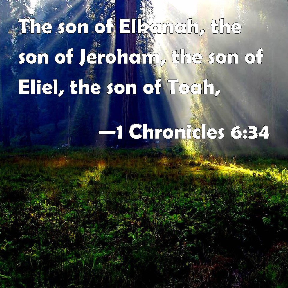 Choose a Background 1 Chronicles 6:34 The son of Elkanah, the son of Jeroham, the son of Eliel, the son of Toah, KJV: The son of Elkanah, the son of Jeroham, the son of Eliel, the son of Toah, DRB: The son of Elcana, the son of Jeroham, the son of Eliel, the son of Thohu, DBT: the son of Elkanah, the son of Jeroham, the son of Eliel, the son of Toah, ERV: the son of Elkanah, the son of Jeroham, the son of Eliel, the son of Toah; WBT: The son of Elkanah, the son of Jeroham, the son of Eliel, the son of Toah, WEB: the son of Elkanah, the son of Jeroham, the son of Eliel, the son of Toah, YLT: son of Elkanah, son of Jeroham, son of Eliel, son of Toah,Links 1 Chronicles 6:34 NIV • 1 Chronicles 6:34 NLT • 1 Chronicles 6:34 ESV • 1 Chronicles 6:34 NASB • 1 Chronicles 6:34 KJV • 1 Chronicles 6:34 Interlinear • 1 Chronicles 6:34 Commentaries • 1 Chronicles 6:34 Parallel Texts • 1 Chronicles 6:34 Bible Apps • 1 Chronicles 6:34 Parallel • Bible Hub |