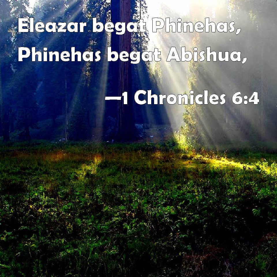 Choose a Background 1 Chronicles 6:4 Eleazar begat Phinehas, Phinehas begat Abishua, KJV: Eleazar begat Phinehas, Phinehas begat Abishua, DRB: Eleazar beget Phinees, and Phinees beget Abisue, DBT: Eleazar begot Phinehas; Phinehas begot Abishua, ERV: Eleazar begat Phinehas, Phinehas begat Abishua; WBT: Eleazar begat Phinehas, Phinehas begat Abishua, WEB: Eleazar became the father of Phinehas, Phinehas became the father of Abishua, YLT: Eleazar begat Phinehas, Phinehas begat Abishua,Links 1 Chronicles 6:4 NIV • 1 Chronicles 6:4 NLT • 1 Chronicles 6:4 ESV • 1 Chronicles 6:4 NASB • 1 Chronicles 6:4 KJV • 1 Chronicles 6:4 Interlinear • 1 Chronicles 6:4 Commentaries • 1 Chronicles 6:4 Parallel Texts • 1 Chronicles 6:4 Bible Apps • 1 Chronicles 6:4 Parallel • Bible Hub |