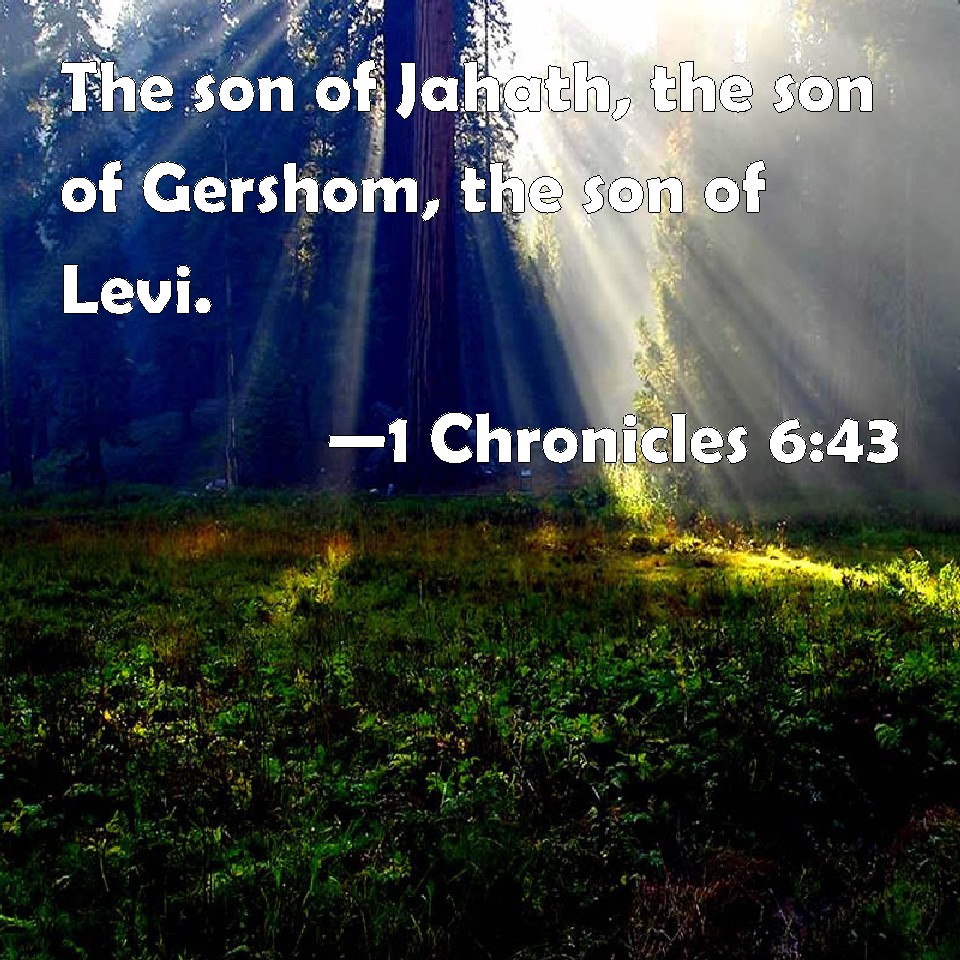 Choose a Background 1 Chronicles 6:43 The son of Jahath, the son of Gershom, the son of Levi. KJV: The son of Jahath, the son of Gershom, the son of Levi. DRB: The son of Jeth, the son of Gerson, the son of Levi. DBT: the son of Jahath, the son of Gershom, the son of Levi. ERV: the son of Jahath, the son of Gershom, the son of Levi. WBT: The son of Jahath, the son of Gershom, the son of Levi. WEB: the son of Jahath, the son of Gershom, the son of Levi. YLT: son of Jahath, son of Gershom, son of Levi.Links 1 Chronicles 6:43 NIV • 1 Chronicles 6:43 NLT • 1 Chronicles 6:43 ESV • 1 Chronicles 6:43 NASB • 1 Chronicles 6:43 KJV • 1 Chronicles 6:43 Interlinear • 1 Chronicles 6:43 Commentaries • 1 Chronicles 6:43 Parallel Texts • 1 Chronicles 6:43 Bible Apps • 1 Chronicles 6:43 Parallel • Bible Hub |
