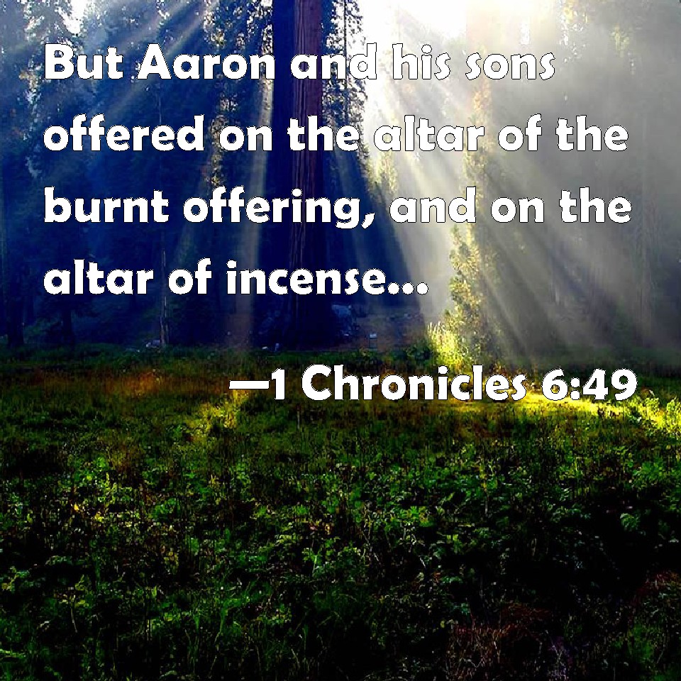 Choose a Background 1 Chronicles 6:49 But Aaron and his sons offered on the altar of the burnt offering, and on the altar of incense, and were appointed for all the work of the place most holy, and to make an atonement for Israel, according to all that Moses the servant of God had commanded. KJV: But Aaron and his sons offered upon the altar of the burnt offering, and on the altar of incense, and were appointed for all the work of the place most holy, and to make an atonement for Israel, according to all that Moses the servant of God had commanded. DRB: But Aaron and his sons offered burnt offerings upon the altar of holocausts, and upon the altar of incense, for very work of the holy of holies: and to pray for Israel according to all that Moses the servant of God had commanded. DBT: And Aaron and his sons offered upon the altar of the burnt-offering, and on the altar of incense, for all the work of the most holy place, and to make atonement for Israel, according to all that Moses the servant of God had commanded. ERV: But Aaron and his sons offered upon the altar of burnt offering, and upon the altar of incense, for all the work of the most holy place, and to make atonement for Israel, according to all that Moses the servant of God had commanded. WBT: But Aaron and his sons offered upon the altar of the burnt-offering, and on the altar of incense, and were appointed for all the work of the place most holy, and to make an atonement for Israel, according to all that Moses the servant of God had commanded. WEB: But Aaron and his sons offered on the altar of burnt offering, and on the altar of incense, for all the work of the most holy place, and to make atonement for Israel, according to all that Moses the servant of God had commanded. YLT: And Aaron and his sons are making perfume on the altar of the burnt-offering, and on the altar of the perfume, for all the work of the holy of holies, and to make atonement for Israel, according to all that Moses servant of God commanded.Links 1 Chronicles 6:49 NIV • 1 Chronicles 6:49 NLT • 1 Chronicles 6:49 ESV • 1 Chronicles 6:49 NASB • 1 Chronicles 6:49 KJV • 1 Chronicles 6:49 Interlinear • 1 Chronicles 6:49 Commentaries • 1 Chronicles 6:49 Parallel Texts • 1 Chronicles 6:49 Bible Apps • 1 Chronicles 6:49 Parallel • Bible Hub |