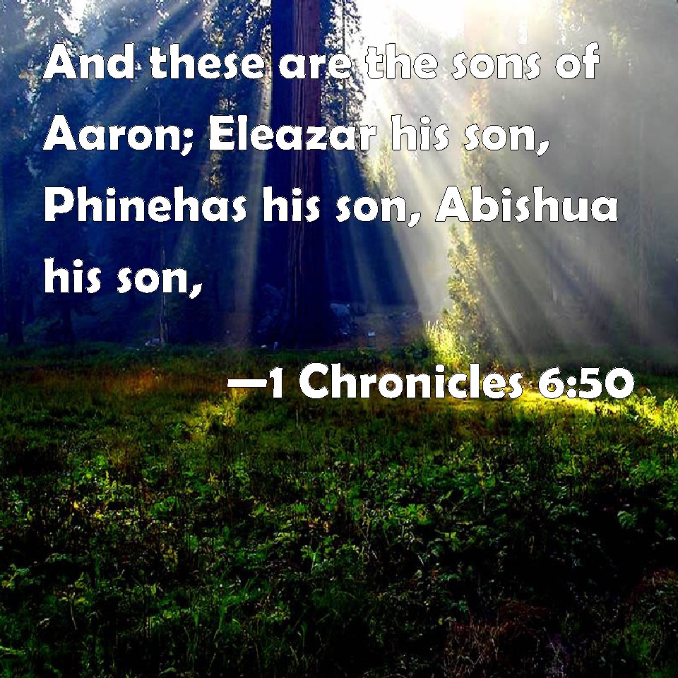 Choose a Background 1 Chronicles 6:50 And these are the sons of Aaron; Eleazar his son, Phinehas his son, Abishua his son, KJV: And these are the sons of Aaron; Eleazar his son, Phinehas his son, Abishua his son, DRB: And these are the sons of Aaron: Eleazar his son, Phinees his son, Abisue his son, DBT: And these are the sons of Aaron: Eleazar his son, Phinehas his son, Abishua his son, ERV: And these are the sons of Aaron; Eleazar his son, Phinehas his son, Abishua his son; WBT: And these are the sons of Aaron; Eleazar his son, Phinehas his son, Abishua his son, WEB: These are the sons of Aaron: Eleazar his son, Phinehas his son, Abishua his son, YLT: And these are sons of Aaron: Eleazar his son, Phinehas his son, Abishua his son,Links 1 Chronicles 6:50 NIV • 1 Chronicles 6:50 NLT • 1 Chronicles 6:50 ESV • 1 Chronicles 6:50 NASB • 1 Chronicles 6:50 KJV • 1 Chronicles 6:50 Interlinear • 1 Chronicles 6:50 Commentaries • 1 Chronicles 6:50 Parallel Texts • 1 Chronicles 6:50 Bible Apps • 1 Chronicles 6:50 Parallel • Bible Hub |