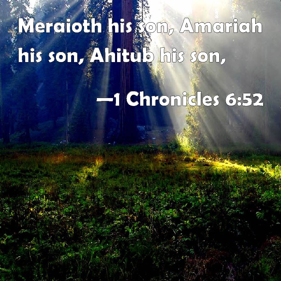Choose a Background 1 Chronicles 6:52 Meraioth his son, Amariah his son, Ahitub his son, KJV: Meraioth his son, Amariah his son, Ahitub his son, DRB: Meraioth his son, Amarias his son, Achitob his son, DBT: Meraioth his son, Amariah his son, Ahitub his son, ERV: Meraioth his son, Amariah his son, Ahitub his son; WBT: Meraioth his son, Amariah his son, Ahitub his son, WEB: Meraioth his son, Amariah his son, Ahitub his son, YLT: Meraioth his son, Amariah his son, Ahitub his son,Links 1 Chronicles 6:52 NIV • 1 Chronicles 6:52 NLT • 1 Chronicles 6:52 ESV • 1 Chronicles 6:52 NASB • 1 Chronicles 6:52 KJV • 1 Chronicles 6:52 Interlinear • 1 Chronicles 6:52 Commentaries • 1 Chronicles 6:52 Parallel Texts • 1 Chronicles 6:52 Bible Apps • 1 Chronicles 6:52 Parallel • Bible Hub |
