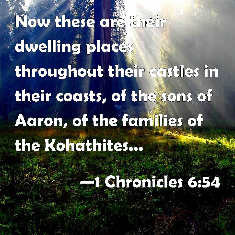 Choose a Background 1 Chronicles 6:54 Now these are their dwelling places throughout their castles in their coasts, of the sons of Aaron, of the families of the Kohathites: for theirs was the lot. KJV: Now these are their dwelling places throughout their castles in their coasts, of the sons of Aaron, of the families of the Kohathites: for theirs was the lot. DRB: And these are their dwelling places by the towns and confines, to wit, of the sons of Aaron, of the families of the Caathites: for they fell to them by lot. DBT: And these are their dwelling-places according to their encampments, within their borders. For the sons of Aaron, of the family of the Kohathites, for theirs was the lot; ERV: Now these are their dwelling places according to their encampments in their borders: to the sons of Aaron, of the families of the Kohathites, for theirs was the first lot, WBT: Now these are their dwelling-places throughout their castles in their limits, of the sons of Aaron, of the families of the Kohathites: for theirs was the lot. WEB: Now these are their dwelling places according to their encampments in their borders: to the sons of Aaron, of the families of the Kohathites (for theirs was the [first] lot), YLT: And these are their dwellings, throughout their towers, in their borders, of the sons of Aaron, of the family of the Kohathite, for theirs was the lot;Links 1 Chronicles 6:54 NIV • 1 Chronicles 6:54 NLT • 1 Chronicles 6:54 ESV • 1 Chronicles 6:54 NASB • 1 Chronicles 6:54 KJV • 1 Chronicles 6:54 Interlinear • 1 Chronicles 6:54 Commentaries • 1 Chronicles 6:54 Parallel Texts • 1 Chronicles 6:54 Bible Apps • 1 Chronicles 6:54 Parallel • Bible Hub |