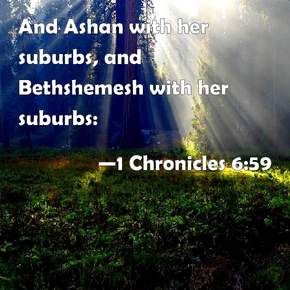 1 Chronicles 6:59 And Ashan with her suburbs, and Bethshemesh with her suburbs: