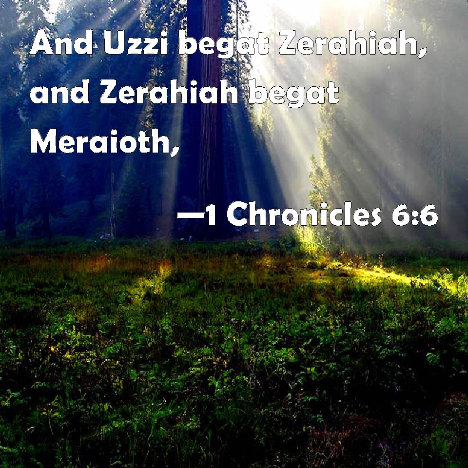 Choose a Background 1 Chronicles 6:6 And Uzzi begat Zerahiah, and Zerahiah begat Meraioth, KJV: And Uzzi begat Zerahiah, and Zerahiah begat Meraioth, DRB: Ozi beget Zaraias, and Zaraias beget Maraioth. DBT: and Uzzi begot Zerahiah, and Zerahiah begot Meraioth; ERV: and Uzzi begat Zerahiah, and Zerahiah begat Meraioth; WBT: And Uzzi begat Zerahiah, and Zerahiah begat Meraioth, WEB: and Uzzi became the father of Zerahiah, and Zerahiah became the father of Meraioth, YLT: and Uzzi begat Zerahiah, and Zerahiah begat Meraioth,Links 1 Chronicles 6:6 NIV • 1 Chronicles 6:6 NLT • 1 Chronicles 6:6 ESV • 1 Chronicles 6:6 NASB • 1 Chronicles 6:6 KJV • 1 Chronicles 6:6 Interlinear • 1 Chronicles 6:6 Commentaries • 1 Chronicles 6:6 Parallel Texts • 1 Chronicles 6:6 Bible Apps • 1 Chronicles 6:6 Parallel • Bible Hub |
