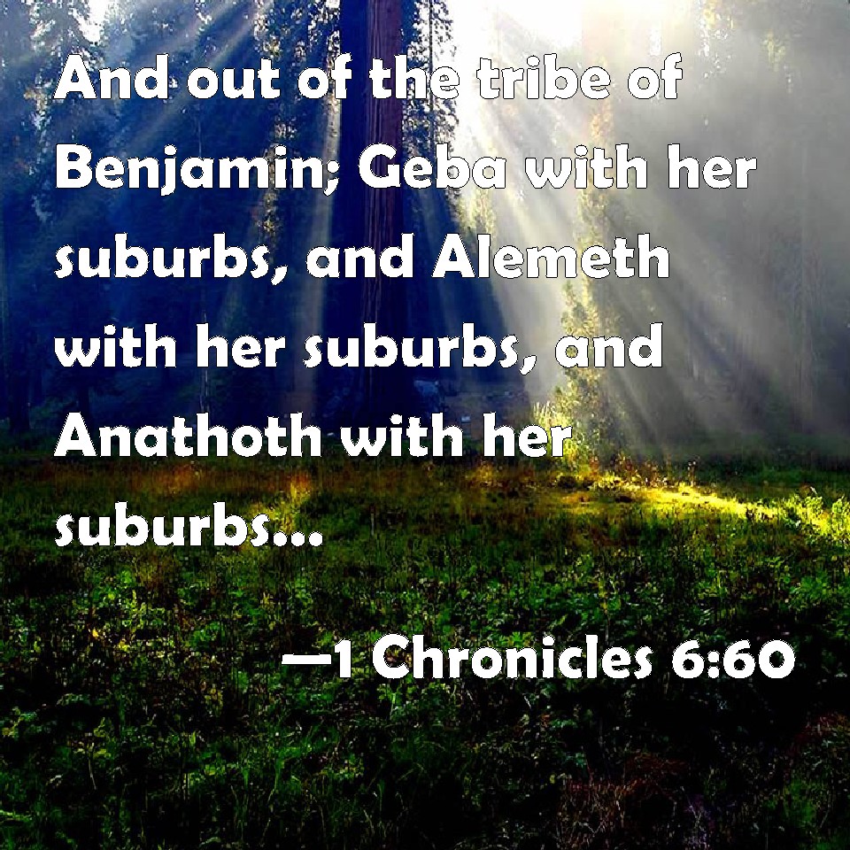 Choose a Background 1 Chronicles 6:60 And out of the tribe of Benjamin; Geba with her suburbs, and Alemeth with her suburbs, and Anathoth with her suburbs. All their cities throughout their families were thirteen cities. KJV: And out of the tribe of Benjamin; Geba with her suburbs, and Alemeth with her suburbs, and Anathoth with her suburbs. All their cities throughout their families were thirteen cities. DRB: And out of the tribe of Benjamin: Gabee and its suburbs, Almath with its suburbs, Anathoth also with its suburbs: all their cities throughout their families were thirteen. DBT: and, out of the tribe of Benjamin, Geba and its suburbs, and Allemeth and its suburbs, and Anathoth and its suburbs: all their cities, thirteen cities, according to their families. ERV: and out of the tribe of Benjamin; Geba with her suburbs, and Allemeth with her suburbs, and Anathoth with her suburbs. All their cities throughout their families were thirteen cities. WBT: And out of the tribe of Benjamin; Geba with its suburbs, and Alemeth with its suburbs, and Anathoth with its suburbs. All their cities throughout their families were thirteen cities. WEB: and out of the tribe of Benjamin, Geba with its suburbs, and Allemeth with its suburbs, and Anathoth with its suburbs. All their cities throughout their families were thirteen cities. YLT: And from the tribe of Benjamin, Geba and its suburbs, and Allemeth and its suburbs, and Anathoth and its suburbs. All their cities are thirteen cities, for their families.Links 1 Chronicles 6:60 NIV • 1 Chronicles 6:60 NLT • 1 Chronicles 6:60 ESV • 1 Chronicles 6:60 NASB • 1 Chronicles 6:60 KJV • 1 Chronicles 6:60 Interlinear • 1 Chronicles 6:60 Commentaries • 1 Chronicles 6:60 Parallel Texts • 1 Chronicles 6:60 Bible Apps • 1 Chronicles 6:60 Parallel • Bible Hub |