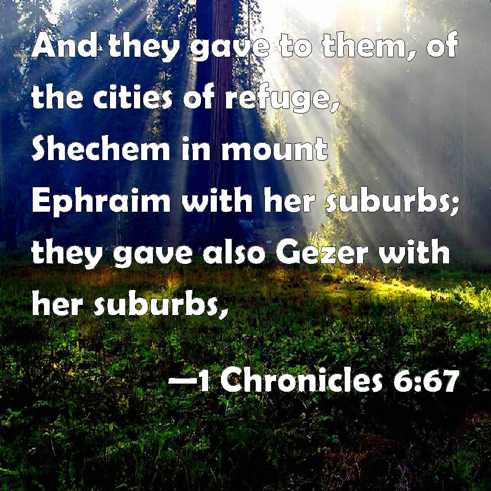 Choose a Background 1 Chronicles 6:67 And they gave to them, of the cities of refuge, Shechem in mount Ephraim with her suburbs; they gave also Gezer with her suburbs, KJV: And they gave unto them, of the cities of refuge, Shechem in mount Ephraim with her suburbs; they gave also Gezer with her suburbs, DRB: And they gave the cities of refuge Sichem with its suburbs in mount Ephraim, and Gazer with its suburbs, DBT: they gave the city of refuge, Shechem and its suburbs in mount Ephraim; and Gezer and its suburbs, ERV: And they gave unto them the cities of refuge, Shechem in the hill country of Ephraim with her suburbs; Gezer also with her suburbs; WBT: And they gave to them, of the cities of refuge, Shechem in mount Ephraim with its suburbs; they gave also Gezer with its suburbs, WEB: They gave to them the cities of refuge, Shechem in the hill country of Ephraim with its suburbs; Gezer also with its suburbs, YLT: and they give to them the cities of refuge, Shechem and its suburbs in the hill-country of Ephraim, and Gezer and its suburbs,Links 1 Chronicles 6:67 NIV • 1 Chronicles 6:67 NLT • 1 Chronicles 6:67 ESV • 1 Chronicles 6:67 NASB • 1 Chronicles 6:67 KJV • 1 Chronicles 6:67 Interlinear • 1 Chronicles 6:67 Commentaries • 1 Chronicles 6:67 Parallel Texts • 1 Chronicles 6:67 Bible Apps • 1 Chronicles 6:67 Parallel • Bible Hub |