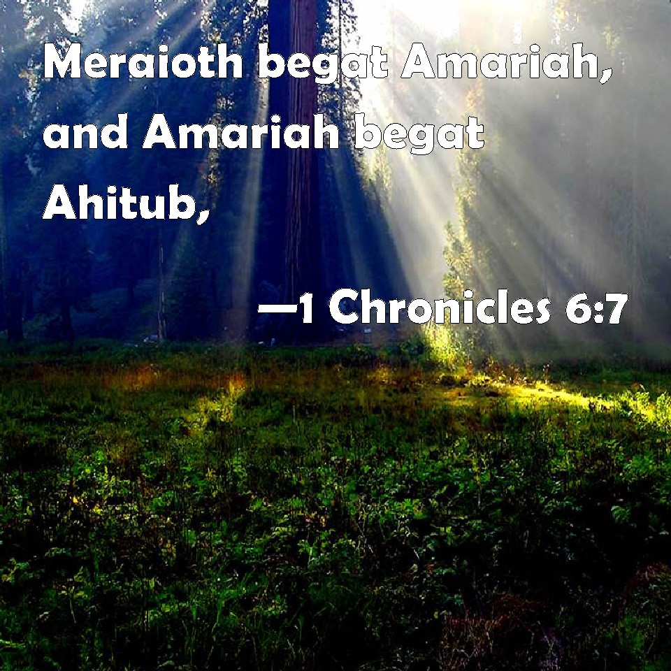 Choose a Background 1 Chronicles 6:7 Meraioth begat Amariah, and Amariah begat Ahitub, KJV: Meraioth begat Amariah, and Amariah begat Ahitub, DRB: And Maraioth beget Amarias, and Amarias beget Achitob. DBT: Meraioth begot Amariah, and Amariah begot Ahitub, ERV: Meraioth begat Amariah, and Amariah begat Ahitub; WBT: Meraioth begat Amariah, and Amariah begat Ahitub, WEB: Meraioth became the father of Amariah, and Amariah became the father of Ahitub, YLT: Meraioth begat Amariah, and Amariah begat Ahitub,Links 1 Chronicles 6:7 NIV • 1 Chronicles 6:7 NLT • 1 Chronicles 6:7 ESV • 1 Chronicles 6:7 NASB • 1 Chronicles 6:7 KJV • 1 Chronicles 6:7 Interlinear • 1 Chronicles 6:7 Commentaries • 1 Chronicles 6:7 Parallel Texts • 1 Chronicles 6:7 Bible Apps • 1 Chronicles 6:7 Parallel • Bible Hub |