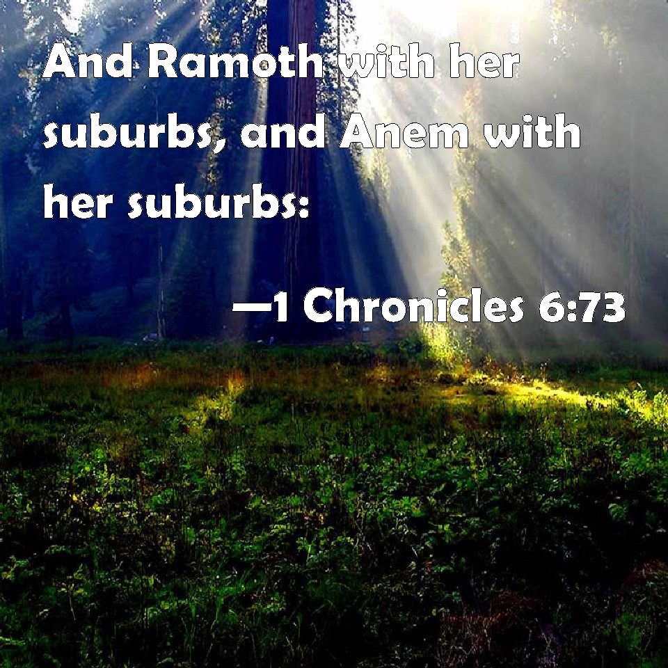 1 Chronicles 6:73 And Ramoth with her suburbs, and Anem with her suburbs: