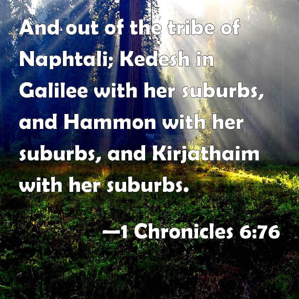 Choose a Background 1 Chronicles 6:76 And out of the tribe of Naphtali; Kedesh in Galilee with her suburbs, and Hammon with her suburbs, and Kirjathaim with her suburbs. KJV: And out of the tribe of Naphtali; Kedesh in Galilee with her suburbs, and Hammon with her suburbs, and Kirjathaim with her suburbs. DRB: And out of the tribe of Nephtali, Cedes in Galilee and its suburbs, Hamon with its suburbs, and Cariathaim, and its suburbs. DBT: and out of the tribe of Naphtali: Kedesh in Galilee and its suburbs, and Hammon and its suburbs, and Kirjathaim and its suburbs. ERV: and out of the tribe of Naphtali; Kedesh in Galilee with her suburbs, and Hammon with her suburbs, and Kiriathaim with her suburbs. WBT: And out of the tribe of Naphtali: Kedesh in Galilee with its suburbs, and Hammon with its suburbs, and Kirjathaim with its suburbs. WEB: and out of the tribe of Naphtali, Kedesh in Galilee with its suburbs, and Hammon with its suburbs, and Kiriathaim with its suburbs. YLT: and from the tribe of Naphtali: Kedesh in Galilee and its suburbs, and Hammon and its suburbs, and Kirjathaim and its suburbs.Links 1 Chronicles 6:76 NIV • 1 Chronicles 6:76 NLT • 1 Chronicles 6:76 ESV • 1 Chronicles 6:76 NASB • 1 Chronicles 6:76 KJV • 1 Chronicles 6:76 Interlinear • 1 Chronicles 6:76 Commentaries • 1 Chronicles 6:76 Parallel Texts • 1 Chronicles 6:76 Bible Apps • 1 Chronicles 6:76 Parallel • Bible Hub |