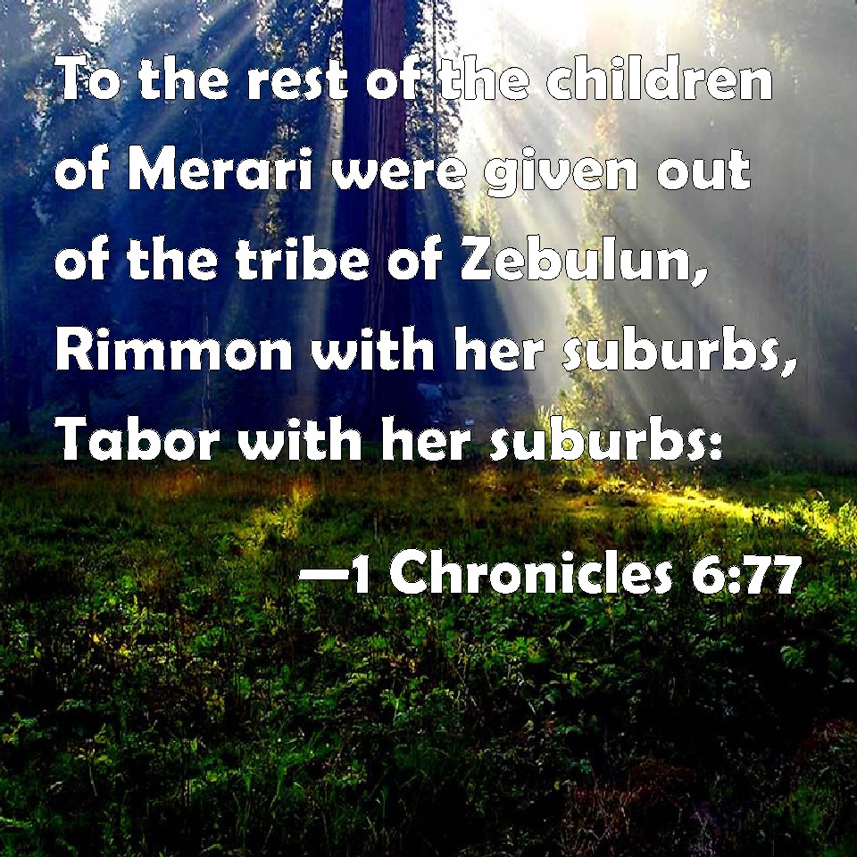 Choose a Background 1 Chronicles 6:77 To the rest of the children of Merari were given out of the tribe of Zebulun, Rimmon with her suburbs, Tabor with her suburbs: KJV: Unto the rest of the children of Merari were given out of the tribe of Zebulun, Rimmon with her suburbs, Tabor with her suburbs: DRB: And to the sons of Merari that remained: out of the tribe of Zabulon, Remmono and its suburbs, and Thabor with its suburbs. DBT: To the children of Merari that remained were given out of the tribe of Zebulun, Rimmono and its suburbs, and Tabor and its suburbs; ERV: Unto the rest of the Levites, the sons of Merari, were given, out of the tribe of Zebulun, Rimmono with her suburbs, Tabor with her suburbs: WBT: To the rest of the children of Merari were given out of the tribe of Zebulun, Rimmon with its suburbs, Tabor with its suburbs: WEB: To the rest of [the Levites], the sons of Merari, [were given], out of the tribe of Zebulun, Rimmono with its suburbs, Tabor with its suburbs; YLT: To the sons of Merari who are left, from the tribe of Zebulun, are Rimmon and its suburbs, Tabor and its suburbs;Links 1 Chronicles 6:77 NIV • 1 Chronicles 6:77 NLT • 1 Chronicles 6:77 ESV • 1 Chronicles 6:77 NASB • 1 Chronicles 6:77 KJV • 1 Chronicles 6:77 Interlinear • 1 Chronicles 6:77 Commentaries • 1 Chronicles 6:77 Parallel Texts • 1 Chronicles 6:77 Bible Apps • 1 Chronicles 6:77 Parallel • Bible Hub |