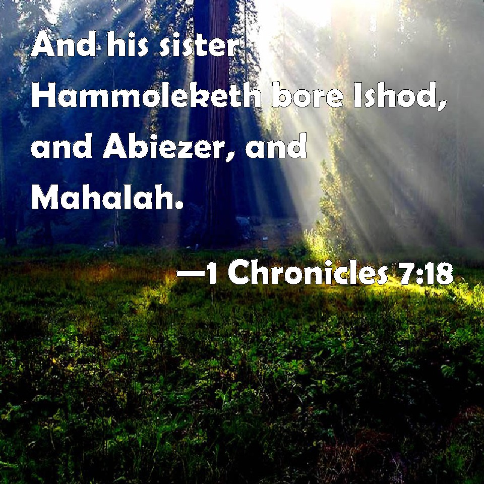 Choose a Background 1 Chronicles 7:18 And his sister Hammoleketh bore Ishod, and Abiezer, and Mahalah. KJV: And his sister Hammoleketh bare Ishod, and Abiezer, and Mahalah. DRB: And his sister named Queen bore Goodlyman, and Abiezer, and Mohola. DBT: And his sister Moleketh bore Ishhod, and Abiezer, and Mahlah. ERV: And his sister Hammolecheth bare Ishhod, and Abiezer, and Mahlah. WBT: And his sister Hammoleketh bore Ishod, and Abiezer, and Mahalah. WEB: His sister Hammolecheth bore Ishhod, and Abiezer, and Mahlah. YLT: And his sister Hammolecheth bare Ishhod, and Abiezer, and Mahalah.Links 1 Chronicles 7:18 NIV • 1 Chronicles 7:18 NLT • 1 Chronicles 7:18 ESV • 1 Chronicles 7:18 NASB • 1 Chronicles 7:18 KJV • 1 Chronicles 7:18 Interlinear • 1 Chronicles 7:18 Commentaries • 1 Chronicles 7:18 Parallel Texts • 1 Chronicles 7:18 Bible Apps • 1 Chronicles 7:18 Parallel • Bible Hub |