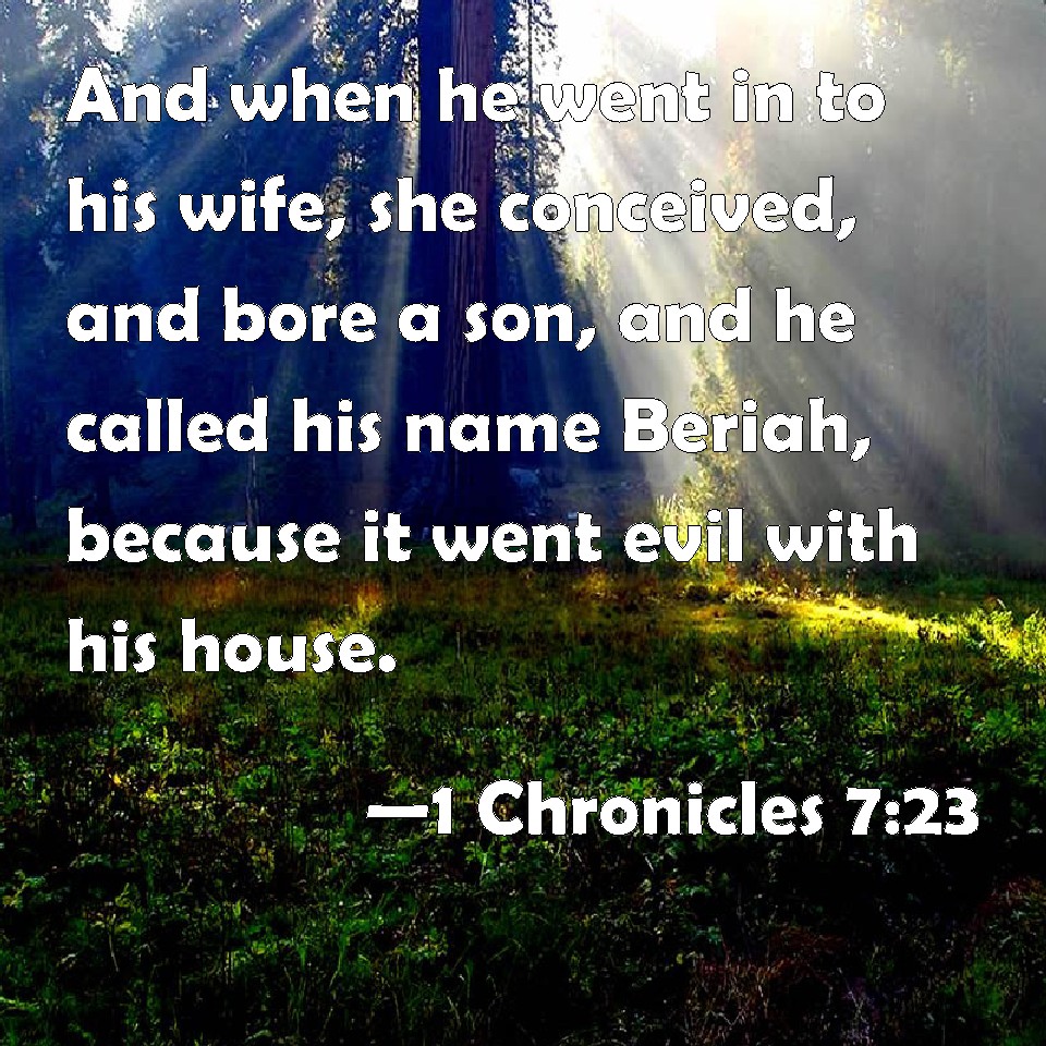 Choose a Background 1 Chronicles 7:23 And when he went in to his wife, she conceived, and bore a son, and he called his name Beriah, because it went evil with his house. KJV: And when he went in to his wife, she conceived, and bare a son, and he called his name Beriah, because it went evil with his house. DRB: And he went in to his wife: and she conceived and bore a son, and he called his name Beria, because he was born when it went evil with his house: DBT: And he went in to his wife; and she conceived, and bore a son; and he called his name Beriah, for he was born when calamity was in his house. ERV: And he went in to his wife, and she conceived, and bare a son, and he called his name Beriah, because it went evil with his house. WBT: And when he went in to his wife, she conceived and bore a son, and he called his name Beriah, because it went evil with his house. WEB: He went in to his wife, and she conceived, and bore a son, and he named him Beriah, because it went evil with his house. YLT: and he goeth in unto his wife, and she conceiveth and beareth a son, and he calleth his name Beriah, because in evil had been his house, — Links 1 Chronicles 7:23 NIV • 1 Chronicles 7:23 NLT • 1 Chronicles 7:23 ESV • 1 Chronicles 7:23 NASB • 1 Chronicles 7:23 KJV • 1 Chronicles 7:23 Interlinear • 1 Chronicles 7:23 Commentaries • 1 Chronicles 7:23 Parallel Texts • 1 Chronicles 7:23 Bible Apps • 1 Chronicles 7:23 Parallel • Bible Hub |