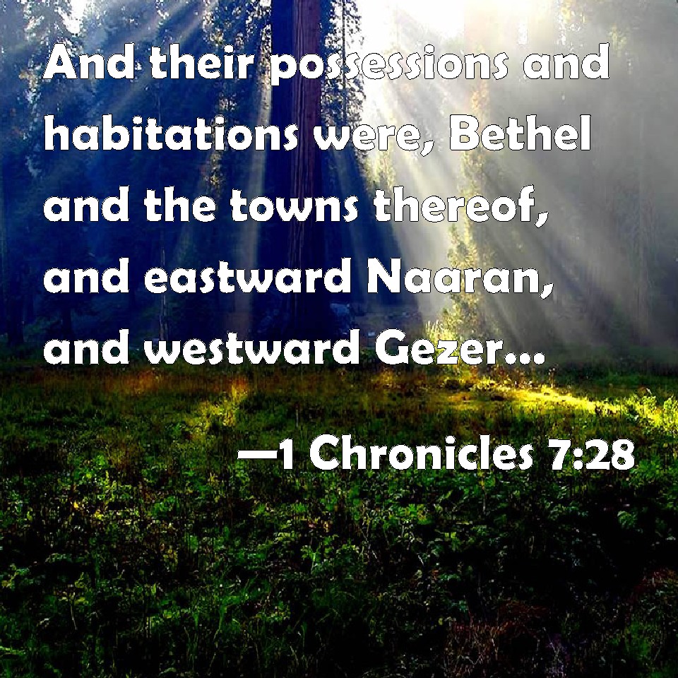 Choose a Background 1 Chronicles 7:28 And their possessions and habitations were, Bethel and the towns thereof, and eastward Naaran, and westward Gezer, with the towns thereof; Shechem also and the towns thereof, to Gaza and the towns thereof: KJV: And their possessions and habitations were, Bethel and the towns thereof, and eastward Naaran, and westward Gezer, with the towns thereof; Shechem also and the towns thereof, unto Gaza and the towns thereof: DRB: And their possessions and habitations were Bethel with her daughters, and eastward Noran, and westward Gazer and her daughters, Sichem also with her daughters, as far as Ass with her daughters. DBT: And their possession and dwelling-places were Bethel and its dependent villages, and eastward Naaran, and westward Gezer and its dependent villages, and Shechem and its dependent villages as far as to Gazah and its dependent villages. ERV: And their possessions and habitations were Beth-el and the towns thereof, and eastward Naaran, and westward Gezer, with the towns thereof; Shechem also and the towns thereof, unto Azzah and the towns thereof: WBT: And their possessions and habitations were, Beth-el, and its towns, and eastward Naaram, and westward Gezer, with its towns; Shechem also and its towns, to Gaza and its towns: WEB: Their possessions and habitations were Bethel and its towns, and eastward Naaran, and westward Gezer, with its towns; Shechem also and its towns, to Azzah and its towns; YLT: And their possession and their dwellings are Beth-El and its small towns, and to the east Naaran, and to the west Gezer and its small towns, and Shechem and its small towns, unto Gaza and its small towns;Links 1 Chronicles 7:28 NIV • 1 Chronicles 7:28 NLT • 1 Chronicles 7:28 ESV • 1 Chronicles 7:28 NASB • 1 Chronicles 7:28 KJV • 1 Chronicles 7:28 Interlinear • 1 Chronicles 7:28 Commentaries • 1 Chronicles 7:28 Parallel Texts • 1 Chronicles 7:28 Bible Apps • 1 Chronicles 7:28 Parallel • Bible Hub |