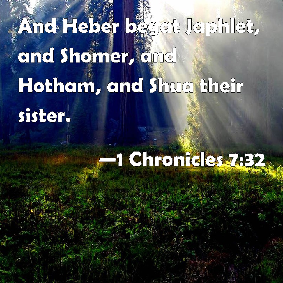 Choose a Background 1 Chronicles 7:32 And Heber begat Japhlet, and Shomer, and Hotham, and Shua their sister. KJV: And Heber begat Japhlet, and Shomer, and Hotham, and Shua their sister. DRB: And Heber beget Jephlat, and Somer, and Hotham, and Suaa their sister. DBT: And Heber begot Japhlet, and Shomer, and Hotham, and Shua their sister. ERV: And Heber begat Japhlet, and Shomer, and Hotham, and Shua their sister. WBT: And Heber begat Japhlet, and Shomer, and Hotham, and Shua their sister. WEB: Heber became the father of Japhlet, and Shomer, and Hotham, and Shua their sister. YLT: And Heber begat Japhlet, and Shomer, and Hotham, and Shua their sister.Links 1 Chronicles 7:32 NIV • 1 Chronicles 7:32 NLT • 1 Chronicles 7:32 ESV • 1 Chronicles 7:32 NASB • 1 Chronicles 7:32 KJV • 1 Chronicles 7:32 Interlinear • 1 Chronicles 7:32 Commentaries • 1 Chronicles 7:32 Parallel Texts • 1 Chronicles 7:32 Bible Apps • 1 Chronicles 7:32 Parallel • Bible Hub |