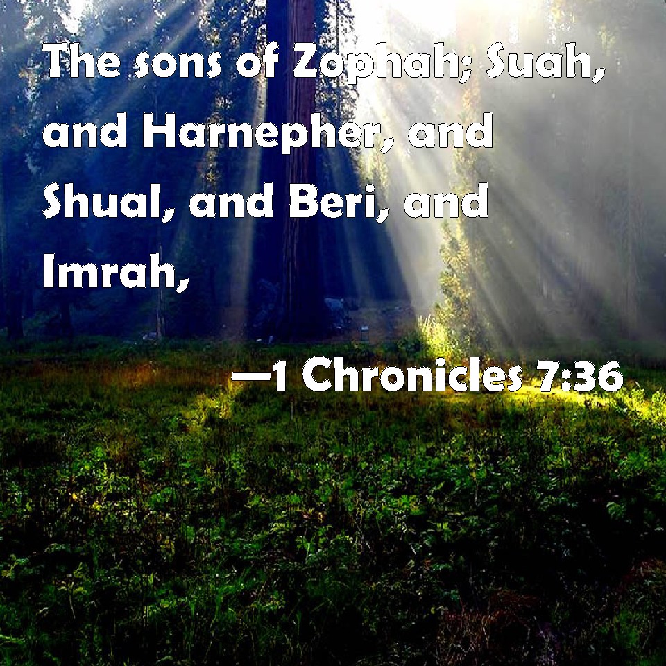 Choose a Background 1 Chronicles 7:36 The sons of Zophah; Suah, and Harnepher, and Shual, and Beri, and Imrah, KJV: The sons of Zophah; Suah, and Harnepher, and Shual, and Beri, and Imrah, DRB: The sons of Supha: Sue, Hernapher, and Sual, and Beri, and Jamra. DBT: The sons of Zophah: Suah, and Harnepher, and Shual, and Beri, and Jimrah, ERV: The sons of Zophah; Suah, and Harnepher, and Shual, and Beri, and Imrah; WBT: The sons of Zophah; Suah, and Harnepher, and Shual, and Beri, and Imrah, WEB: The sons of Zophah: Suah, and Harnepher, and Shual, and Beri, and Imrah, YLT: Sons of Zophah: Suah, and Harnepher, and Shual, and Beri, and Imrah,Links 1 Chronicles 7:36 NIV • 1 Chronicles 7:36 NLT • 1 Chronicles 7:36 ESV • 1 Chronicles 7:36 NASB • 1 Chronicles 7:36 KJV • 1 Chronicles 7:36 Interlinear • 1 Chronicles 7:36 Commentaries • 1 Chronicles 7:36 Parallel Texts • 1 Chronicles 7:36 Bible Apps • 1 Chronicles 7:36 Parallel • Bible Hub |