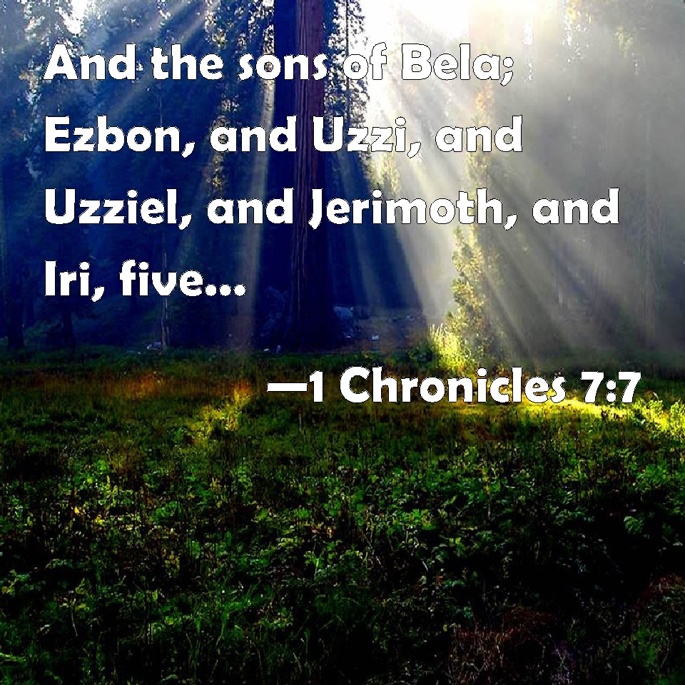 Choose a Background 1 Chronicles 7:7 And the sons of Bela; Ezbon, and Uzzi, and Uzziel, and Jerimoth, and Iri, five; heads of the house of their fathers, mighty men of valor; and were reckoned by their genealogies twenty and two thousand and thirty and four. KJV: And the sons of Bela; Ezbon, and Uzzi, and Uzziel, and Jerimoth, and Iri, five; heads of the house of their fathers, mighty men of valour; and were reckoned by their genealogies twenty and two thousand and thirty and four. DRB: The sons of Bela: Esbon, and Ozi, and Ozial, and Jerimoth and Urai, five chiefs of their families, and most valiant warriors, and their number was twenty-two thousand and thirty-four. DBT: And the sons of Bela: Ezbon, and Uzzi, and Uzziel, and Jerimoth, and Iri, five; heads of fathers' houses, mighty men of valour; and they were registered by their genealogy twenty-two thousand and thirty-four. ERV: And the sons of Bela; Ezbon, and Uzzi, and Uzziel, and Jerimoth, and Iri, five; heads of fathers' houses, mighty men of valour; and they were reckoned by genealogy twenty and two thousand and thirty and four. WBT: And the sons of Bela; Ezbon, and Uzzi, and Uzziel, and Jerimoth, and Iri, five; heads of the house of their fathers, mighty men of valor; and were reckoned by their genealogies twenty and two thousand and thirty and four. WEB: The sons of Bela: Ezbon, and Uzzi, and Uzziel, and Jerimoth, and Iri, five; heads of fathers' houses, mighty men of valor; and they were reckoned by genealogy twenty-two thousand thirty-four. YLT: And sons of Bela: Ezbon, and Uzzi, and Uzziel, and Jerimoth, and Iri, five; heads of a house of fathers, mighty of valour, with their genealogy, twenty and two thousand, and thirty and four.Links 1 Chronicles 7:7 NIV • 1 Chronicles 7:7 NLT • 1 Chronicles 7:7 ESV • 1 Chronicles 7:7 NASB • 1 Chronicles 7:7 KJV • 1 Chronicles 7:7 Interlinear • 1 Chronicles 7:7 Commentaries • 1 Chronicles 7:7 Parallel Texts • 1 Chronicles 7:7 Bible Apps • 1 Chronicles 7:7 Parallel • Bible Hub |