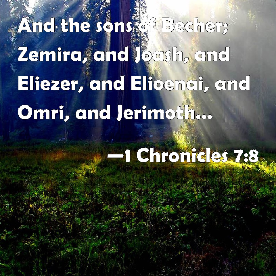 Choose a Background 1 Chronicles 7:8 And the sons of Becher; Zemira, and Joash, and Eliezer, and Elioenai, and Omri, and Jerimoth, and Abiah, and Anathoth, and Alameth. All these are the sons of Becher. KJV: And the sons of Becher; Zemira, and Joash, and Eliezer, and Elioenai, and Omri, and Jerimoth, and Abiah, and Anathoth, and Alameth. All these are the sons of Becher. DRB: And the sons of Bechor were Zamira, and Joas, and Eliezer, and Elioenai, and Amai, and Jerimoth, and Abia, and Anathoth, and Almath: all these were the sons of Bechor. DBT: And the sons of Becher: Zemirah, and Joash, and Eliezer, and Elioenai, and Omri, and Jeremoth, and Abijah, and Anathoth, and Alemeth; all these were the sons of Becher. ERV: And the sons of Becher; Zemirah, and Joash, and Eliezer, and Elioenai, and Omri, and Jeremoth, and Abijah, and Anathoth, and Alemeth. All these were the sons of Becher. WBT: And the sons of Becher; Zemira, and Joash, and Eliezer, and Elioenai, and Omri, and Jerimoth, and Abiah, and Anathoth, and Alameth. All these are the sons of Becher. WEB: The sons of Becher: Zemirah, and Joash, and Eliezer, and Elioenai, and Omri, and Jeremoth, and Abijah, and Anathoth, and Alemeth. All these were the sons of Becher. YLT: And sons of Becher: Zemirah, and Joash, and Eliezar, and Elioenai, and Omri, and Jerimoth, and Abijah, and Anathoth, and Alameth. All these are sons of Becher,Links 1 Chronicles 7:8 NIV • 1 Chronicles 7:8 NLT • 1 Chronicles 7:8 ESV • 1 Chronicles 7:8 NASB • 1 Chronicles 7:8 KJV • 1 Chronicles 7:8 Interlinear • 1 Chronicles 7:8 Commentaries • 1 Chronicles 7:8 Parallel Texts • 1 Chronicles 7:8 Bible Apps • 1 Chronicles 7:8 Parallel • Bible Hub |