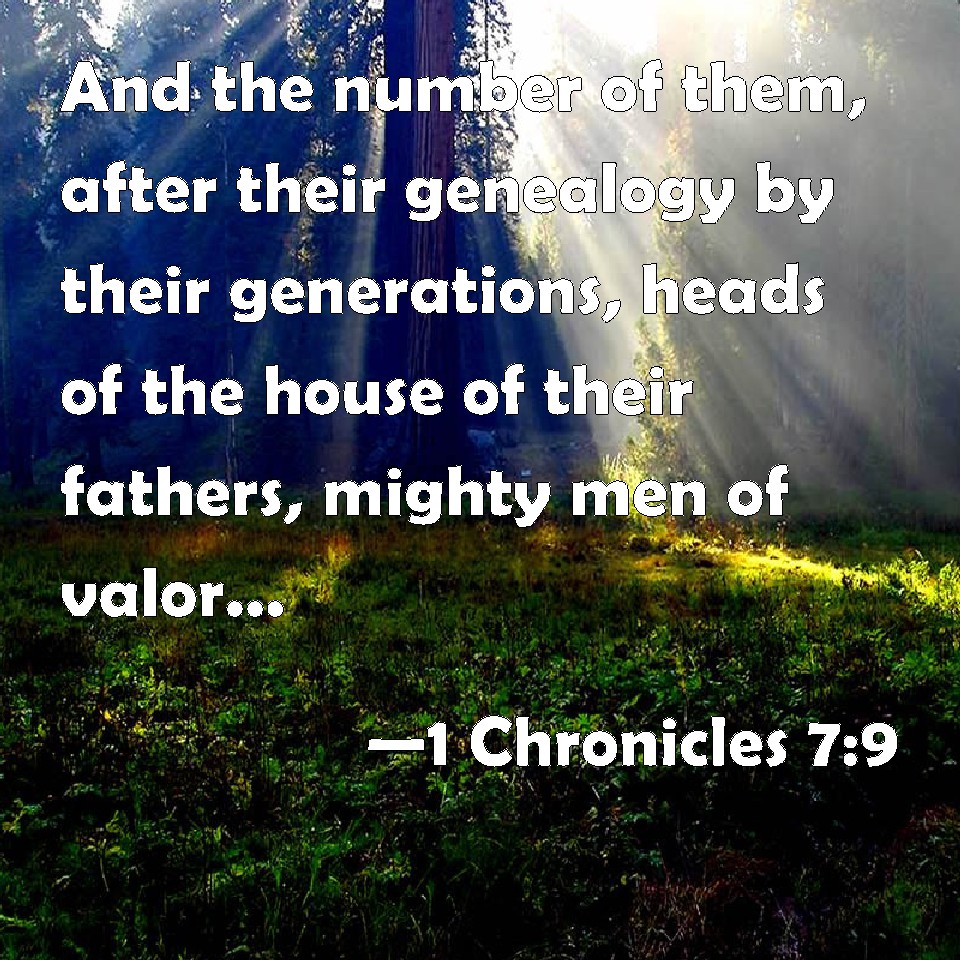 Choose a Background 1 Chronicles 7:9 And the number of them, after their genealogy by their generations, heads of the house of their fathers, mighty men of valor, was twenty thousand and two hundred. KJV: And the number of them, after their genealogy by their generations, heads of the house of their fathers, mighty men of valour, was twenty thousand and two hundred. DRB: And they were numbered by the families, heads of their kindreds, most valiant men for war, twenty thousand and two hundred. DBT: And they were registered by their genealogy by their generations, heads of their fathers' houses, mighty men of valour, twenty thousand two hundred. ERV: And they were reckoned by genealogy, after their generations, heads of their fathers' houses, mighty men of valour, twenty thousand and two hundred. WBT: And the number of them, after their genealogy by their generations, heads of the house of their fathers, mighty men of valor, was twenty thousand and two hundred. WEB: They were reckoned by genealogy, after their generations, heads of their fathers' houses, mighty men of valor, twenty thousand two hundred. YLT: with their genealogy, after their generations, heads of a house of their fathers, mighty of valour, twenty thousand and two hundred.Links 1 Chronicles 7:9 NIV • 1 Chronicles 7:9 NLT • 1 Chronicles 7:9 ESV • 1 Chronicles 7:9 NASB • 1 Chronicles 7:9 KJV • 1 Chronicles 7:9 Interlinear • 1 Chronicles 7:9 Commentaries • 1 Chronicles 7:9 Parallel Texts • 1 Chronicles 7:9 Bible Apps • 1 Chronicles 7:9 Parallel • Bible Hub |