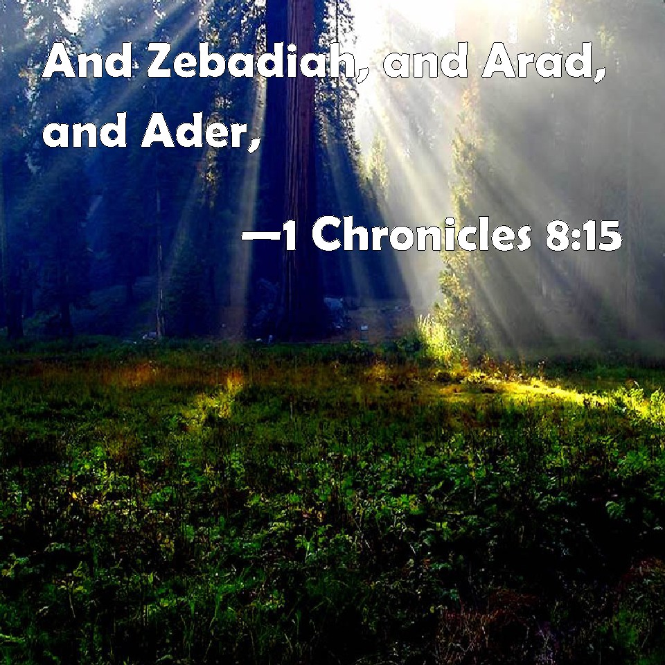 Choose a Background 1 Chronicles 8:15 And Zebadiah, and Arad, and Ader, KJV: And Zebadiah, and Arad, and Ader, DRB: And Zabadia, and Arod, and Heder, DBT: and Zebadiah, and Arad, and Eder, ERV: and Zebadiah, and Arad, and Eder; WBT: And Zebadiah, and Arad, and Ader, WEB: and Zebadiah, and Arad, and Eder, YLT: and Zebadiah, and Arad, and Ader,Links 1 Chronicles 8:15 NIV • 1 Chronicles 8:15 NLT • 1 Chronicles 8:15 ESV • 1 Chronicles 8:15 NASB • 1 Chronicles 8:15 KJV • 1 Chronicles 8:15 Interlinear • 1 Chronicles 8:15 Commentaries • 1 Chronicles 8:15 Parallel Texts • 1 Chronicles 8:15 Bible Apps • 1 Chronicles 8:15 Parallel • Bible Hub |