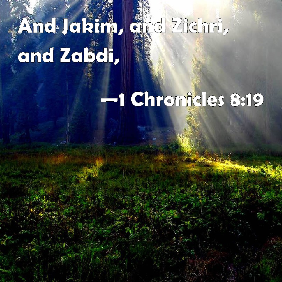 Choose a Background 1 Chronicles 8:19 And Jakim, and Zichri, and Zabdi, KJV: And Jakim, and Zichri, and Zabdi, DRB: And Jacim, and Zechri, and Zabdi, DBT: And Jakim, and Zichri, and Zabdi, ERV: and Jakim, and Zichri, and Zabdi; WBT: And Jakim, and Zichri, and Zabdi, WEB: and Jakim, and Zichri, and Zabdi, YLT: And Jakim, and Zichri, and Zabdi,Links 1 Chronicles 8:19 NIV • 1 Chronicles 8:19 NLT • 1 Chronicles 8:19 ESV • 1 Chronicles 8:19 NASB • 1 Chronicles 8:19 KJV • 1 Chronicles 8:19 Interlinear • 1 Chronicles 8:19 Commentaries • 1 Chronicles 8:19 Parallel Texts • 1 Chronicles 8:19 Bible Apps • 1 Chronicles 8:19 Parallel • Bible Hub |