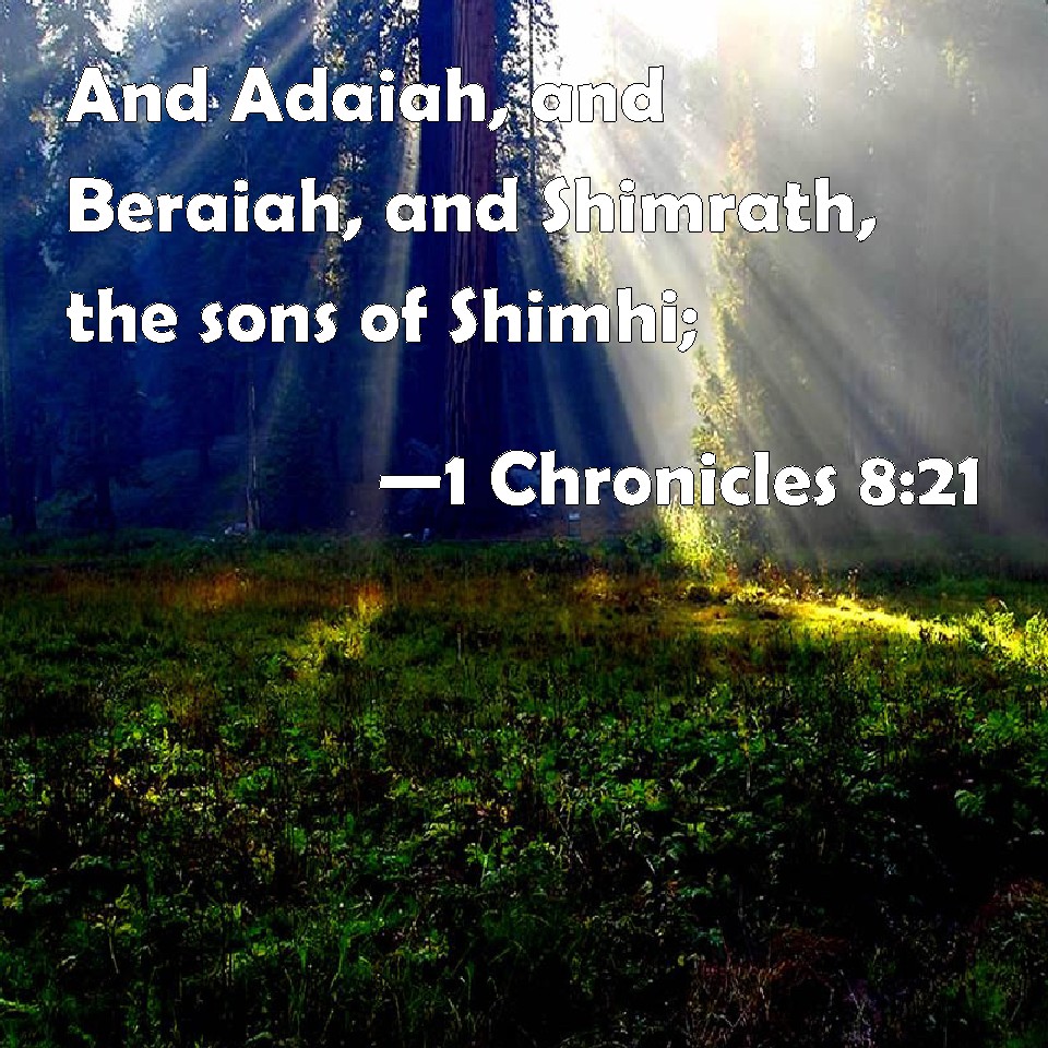 Choose a Background 1 Chronicles 8:21 And Adaiah, and Beraiah, and Shimrath, the sons of Shimhi; KJV: And Adaiah, and Beraiah, and Shimrath, the sons of Shimhi; DRB: And Adaia, and Baraia, and Samareth, the sons of Semei. DBT: and Adaiah, and Beraiah, and Shimrath were the sons of Shimei. ERV: and Adaiah, and Beraiah, and Shimrath, the sons of Shimei; WBT: And Adaiah, and Beraiah, and Shimrath, the sons of Shimhi; WEB: and Adaiah, and Beraiah, and Shimrath, the sons of Shimei, YLT: and Adaiah, and Beraiah, and Shimrath, sons of Shimei;Links 1 Chronicles 8:21 NIV • 1 Chronicles 8:21 NLT • 1 Chronicles 8:21 ESV • 1 Chronicles 8:21 NASB • 1 Chronicles 8:21 KJV • 1 Chronicles 8:21 Interlinear • 1 Chronicles 8:21 Commentaries • 1 Chronicles 8:21 Parallel Texts • 1 Chronicles 8:21 Bible Apps • 1 Chronicles 8:21 Parallel • Bible Hub |