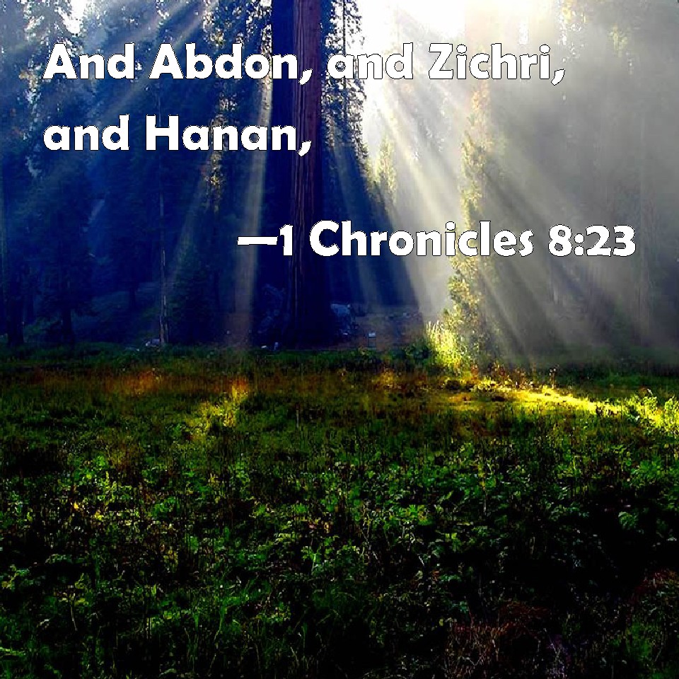 Choose a Background 1 Chronicles 8:23 And Abdon, and Zichri, and Hanan, KJV: And Abdon, and Zichri, and Hanan, DRB: And Abdon, and Zechri, and Hanan, DBT: and Abdon, and Zichri, and Hanan, ERV: and Abdon, and Zichri, and Hanan; WBT: And Abdon, and Zichri, and Hanan, WEB: and Abdon, and Zichri, and Hanan, YLT: and Abdon, and Zichri, and Hanan,Links 1 Chronicles 8:23 NIV • 1 Chronicles 8:23 NLT • 1 Chronicles 8:23 ESV • 1 Chronicles 8:23 NASB • 1 Chronicles 8:23 KJV • 1 Chronicles 8:23 Interlinear • 1 Chronicles 8:23 Commentaries • 1 Chronicles 8:23 Parallel Texts • 1 Chronicles 8:23 Bible Apps • 1 Chronicles 8:23 Parallel • Bible Hub |