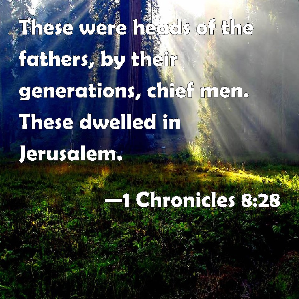 Choose a Background 1 Chronicles 8:28 These were heads of the fathers, by their generations, chief men. These dwelled in Jerusalem. KJV: These were heads of the fathers, by their generations, chief men. These dwelt in Jerusalem. DRB: These were the chief fathers, and heads of their families who dwelt in Jerusalem. DBT: These were the chief fathers, according to their generations, principal men; these dwelt in Jerusalem. ERV: These were heads of fathers' houses throughout their generations, chief men: these dwelt in Jerusalem. WBT: These were heads of the fathers, by their generations, chief men. These dwelt in Jerusalem. WEB: These were heads of fathers' [houses] throughout their generations, chief men: these lived in Jerusalem. YLT: These are heads of fathers, by their generations, heads; these dwelt in Jerusalem.Links 1 Chronicles 8:28 NIV • 1 Chronicles 8:28 NLT • 1 Chronicles 8:28 ESV • 1 Chronicles 8:28 NASB • 1 Chronicles 8:28 KJV • 1 Chronicles 8:28 Interlinear • 1 Chronicles 8:28 Commentaries • 1 Chronicles 8:28 Parallel Texts • 1 Chronicles 8:28 Bible Apps • 1 Chronicles 8:28 Parallel • Bible Hub |