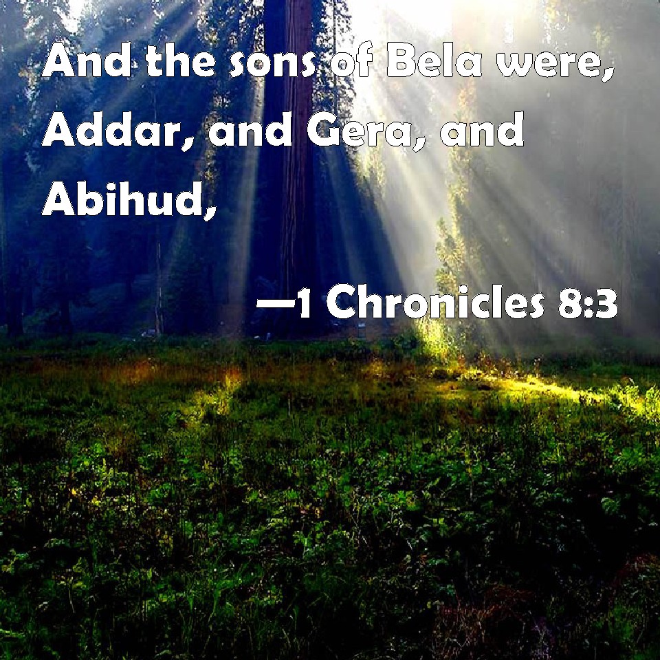 Choose a Background 1 Chronicles 8:3 And the sons of Bela were, Addar, and Gera, and Abihud, KJV: And the sons of Bela were, Addar, and Gera, and Abihud, DRB: And the sons of Bale were Addar, and Gera, and Abiud, DBT: And Bela had sons: Addar, and Gera, and Abihud, ERV: And Bela had sons, Addar, and Gera, and Abihud; WBT: And the sons of Bela were Addar, and Gera, and Abihud, WEB: Bela had sons: Addar, and Gera, and Abihud, YLT: And there are sons to Bela: Addar, and Gera,Links 1 Chronicles 8:3 NIV • 1 Chronicles 8:3 NLT • 1 Chronicles 8:3 ESV • 1 Chronicles 8:3 NASB • 1 Chronicles 8:3 KJV • 1 Chronicles 8:3 Interlinear • 1 Chronicles 8:3 Commentaries • 1 Chronicles 8:3 Parallel Texts • 1 Chronicles 8:3 Bible Apps • 1 Chronicles 8:3 Parallel • Bible Hub |
