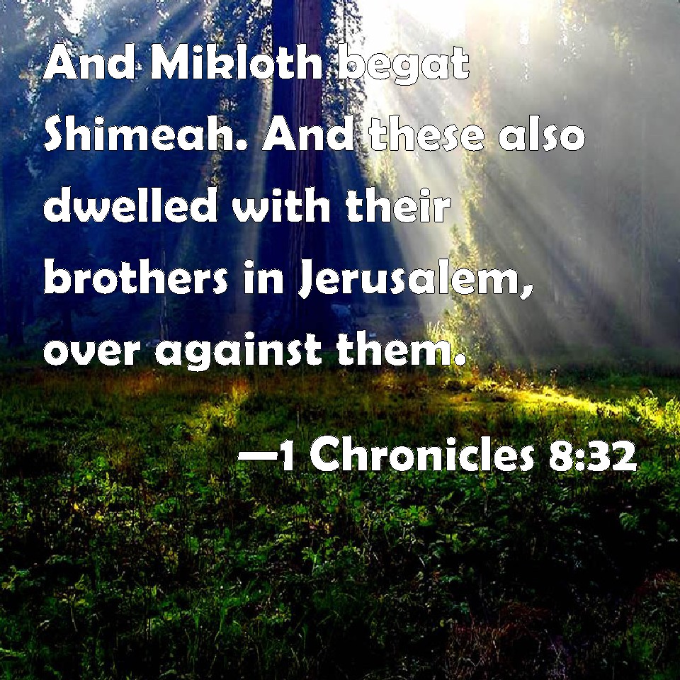 1 Chronicles 8:32 And Mikloth begat Shimeah. And these also dwelled with their brothers in Jerusalem, over against them.
