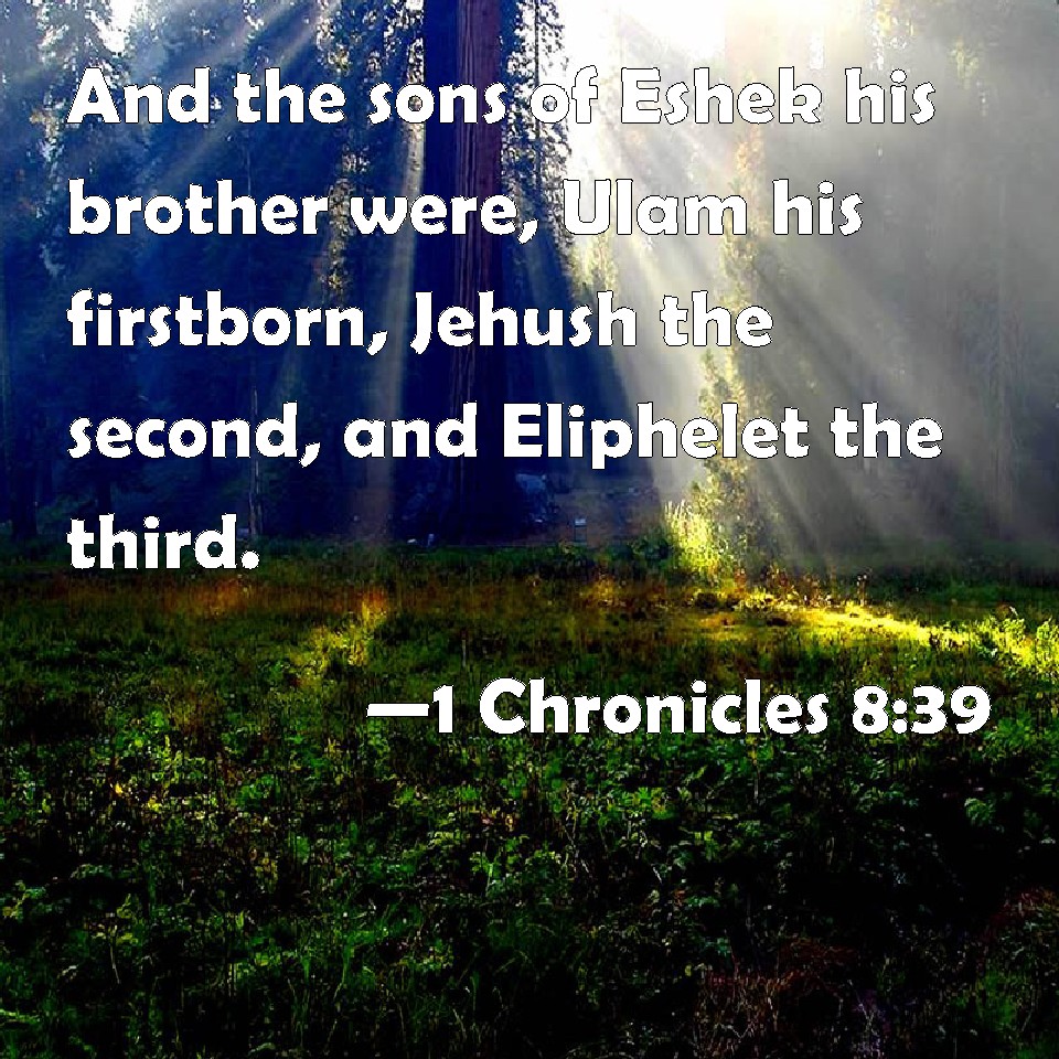 Choose a Background 1 Chronicles 8:39 And the sons of Eshek his brother were, Ulam his firstborn, Jehush the second, and Eliphelet the third. KJV: And the sons of Eshek his brother were, Ulam his firstborn, Jehush the second, and Eliphelet the third. DRB: And the sons of Esec, his brother, were Ulam the firstborn, and Jehus the second, and Eliphelet the third. DBT: And the sons of Eshek his brother were Ulam his firstborn, Jeush the second, and Eliphelet the third. ERV: And the sons of Eshek his brother; Ulam his firstborn, Jeush the second, and Eliphelet the third. WBT: And the sons of Eshek his brother were, Ulam his first-born, Jehush the second, and Eliphelet the third. WEB: The sons of Eshek his brother: Ulam his firstborn, Jeush the second, and Eliphelet the third. YLT: And sons of Eshek his brother: Ulam his first-born, Jehush the second, and Eliphelet the third.Links 1 Chronicles 8:39 NIV • 1 Chronicles 8:39 NLT • 1 Chronicles 8:39 ESV • 1 Chronicles 8:39 NASB • 1 Chronicles 8:39 KJV • 1 Chronicles 8:39 Interlinear • 1 Chronicles 8:39 Commentaries • 1 Chronicles 8:39 Parallel Texts • 1 Chronicles 8:39 Bible Apps • 1 Chronicles 8:39 Parallel • Bible Hub |