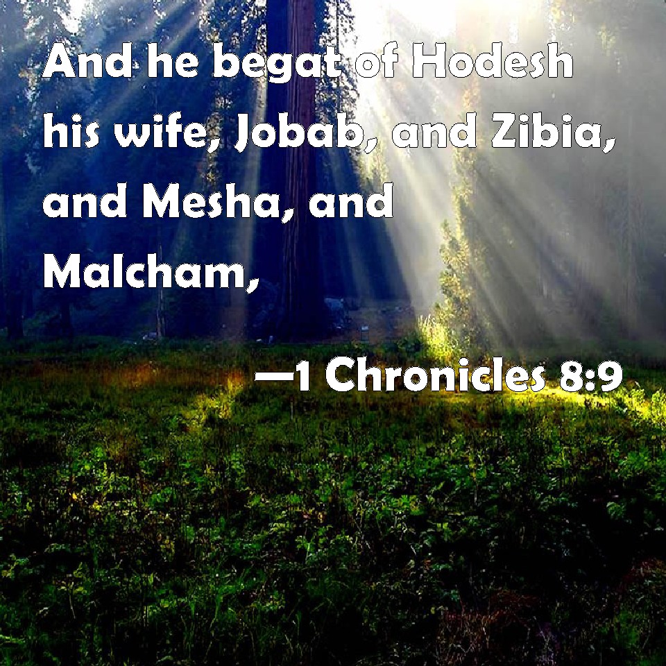 Choose a Background 1 Chronicles 8:9 And he begat of Hodesh his wife, Jobab, and Zibia, and Mesha, and Malcham, KJV: And he begat of Hodesh his wife, Jobab, and Zibia, and Mesha, and Malcham, DRB: And he beget of Hodes his wife Jobab, and Sebia, and Mesa, and Molchom, DBT: And he begot of Hodesh his wife: Jobab, and Zibia, and Mesha, and Malcham, ERV: And he begat of Hodesh his wife, Jobab, and Zibia, and Mesha, and Malcam; WBT: And he begat of Hodesh his wife, Jobab, and Zibia, and Mesha, and Malcham, WEB: He became the father of Hodesh his wife, Jobab, and Zibia, and Mesha, and Malcam, YLT: And he begetteth of Hodesh his wife, Jobab, and Zibia, and Mesha, and Malcham,Links 1 Chronicles 8:9 NIV • 1 Chronicles 8:9 NLT • 1 Chronicles 8:9 ESV • 1 Chronicles 8:9 NASB • 1 Chronicles 8:9 KJV • 1 Chronicles 8:9 Interlinear • 1 Chronicles 8:9 Commentaries • 1 Chronicles 8:9 Parallel Texts • 1 Chronicles 8:9 Bible Apps • 1 Chronicles 8:9 Parallel • Bible Hub |