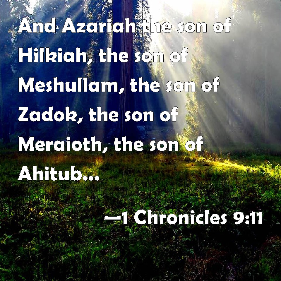 Choose a Background 1 Chronicles 9:11 And Azariah the son of Hilkiah, the son of Meshullam, the son of Zadok, the son of Meraioth, the son of Ahitub, the ruler of the house of God; KJV: And Azariah the son of Hilkiah, the son of Meshullam, the son of Zadok, the son of Meraioth, the son of Ahitub, the ruler of the house of God; DRB: And Azarias the son of Helcias, the son of Mosollam, the son of Sadoc, the son of Maraioth, the son of Achitob, high priest of the house of God. DBT: and Azariah the son of Hilkijah, the son of Meshullam, the son of Zadok, the son of Meraioth, the son of Ahitub, the ruler of the house of God; ERV: and Azariah the son of Hilkiah, the son of Meshullam; the son of Zadok, the son of Meraioth, the son of Ahitub, the ruler of the house of God; WBT: And Azariah the son of Hilkiah, the son of Meshullam, the son of Zadok, the son of Meraioth, the son of Ahitub, the ruler of the house of God; WEB: and Azariah the son of Hilkiah, the son of Meshullam, the son of Zadok, the son of Meraioth, the son of Ahitub, the ruler of the house of God; YLT: and Azariah son of Hilkiah, son of Meshullam, son of Zadok, son of Meraioth, son of Ahitub, leader in the house of God;Links 1 Chronicles 9:11 NIV • 1 Chronicles 9:11 NLT • 1 Chronicles 9:11 ESV • 1 Chronicles 9:11 NASB • 1 Chronicles 9:11 KJV • 1 Chronicles 9:11 Interlinear • 1 Chronicles 9:11 Commentaries • 1 Chronicles 9:11 Parallel Texts • 1 Chronicles 9:11 Bible Apps • 1 Chronicles 9:11 Parallel • Bible Hub |