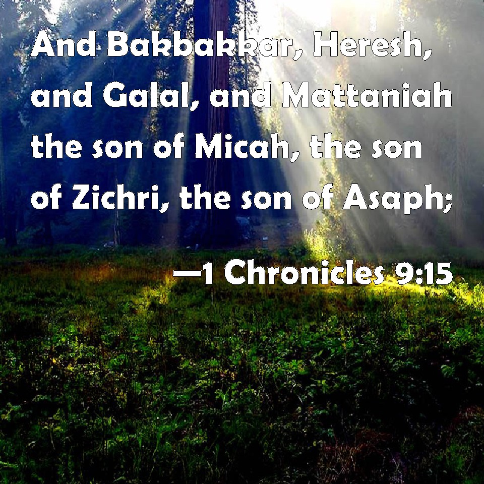 Choose a Background 1 Chronicles 9:15 And Bakbakkar, Heresh, and Galal, and Mattaniah the son of Micah, the son of Zichri, the son of Asaph; KJV: And Bakbakkar, Heresh, and Galal, and Mattaniah the son of Micah, the son of Zichri, the son of Asaph; DRB: And Bacbacar the carpenter, and Galal, and Mathania the son of Micha, the son of Zechri the son of Asaph: DBT: and Bakbakkar, Heresh, and Galal; and Mattaniah the son of Micah, the son of Zichri, the son of Asaph; ERV: and Bakbakkar, Heresh, and Galal, and Mattaniah the son of Mica, the son of Zichri, the son of Asaph; WBT: And Bakbakkar, Heresh, and Galal, and Mattaniah the son of Micah, the son of Zichri, the son of Asaph; WEB: and Bakbakkar, Heresh, and Galal, and Mattaniah the son of Mica, the son of Zichri, the son of Asaph, YLT: and Bakbakkar, Heresh, and Galal, and Mattaniah son of Micah, son of Zichri, son of Asaph;Links 1 Chronicles 9:15 NIV • 1 Chronicles 9:15 NLT • 1 Chronicles 9:15 ESV • 1 Chronicles 9:15 NASB • 1 Chronicles 9:15 KJV • 1 Chronicles 9:15 Interlinear • 1 Chronicles 9:15 Commentaries • 1 Chronicles 9:15 Parallel Texts • 1 Chronicles 9:15 Bible Apps • 1 Chronicles 9:15 Parallel • Bible Hub |