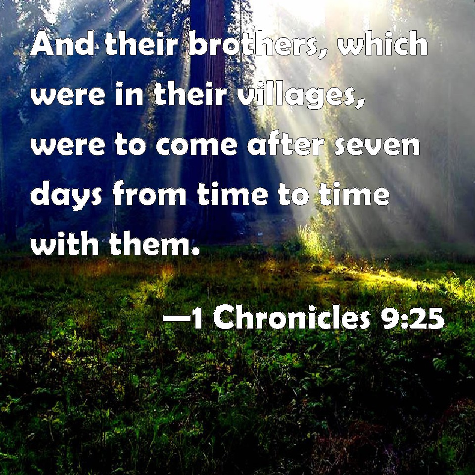 Choose a Background 1 Chronicles 9:25 And their brothers, which were in their villages, were to come after seven days from time to time with them. KJV: And their brethren, which were in their villages, were to come after seven days from time to time with them. DRB: And their brethren dwelt in villages, and came upon their sabbath days from time to time. DBT: And their brethren, in their villages, were to come after every seven days from time to time with them. ERV: And their brethren, and their villages, were to come in every seven days from time to time to be with them: WBT: And their brethren, who were in their villages, were to come after seven days from time to time with them. WEB: Their brothers, in their villages, were to come in every seven days from time to time to be with them: YLT: And their brethren in their villages are to come in for seven days from time to time with these.Links 1 Chronicles 9:25 NIV • 1 Chronicles 9:25 NLT • 1 Chronicles 9:25 ESV • 1 Chronicles 9:25 NASB • 1 Chronicles 9:25 KJV • 1 Chronicles 9:25 Interlinear • 1 Chronicles 9:25 Commentaries • 1 Chronicles 9:25 Parallel Texts • 1 Chronicles 9:25 Bible Apps • 1 Chronicles 9:25 Parallel • Bible Hub |
