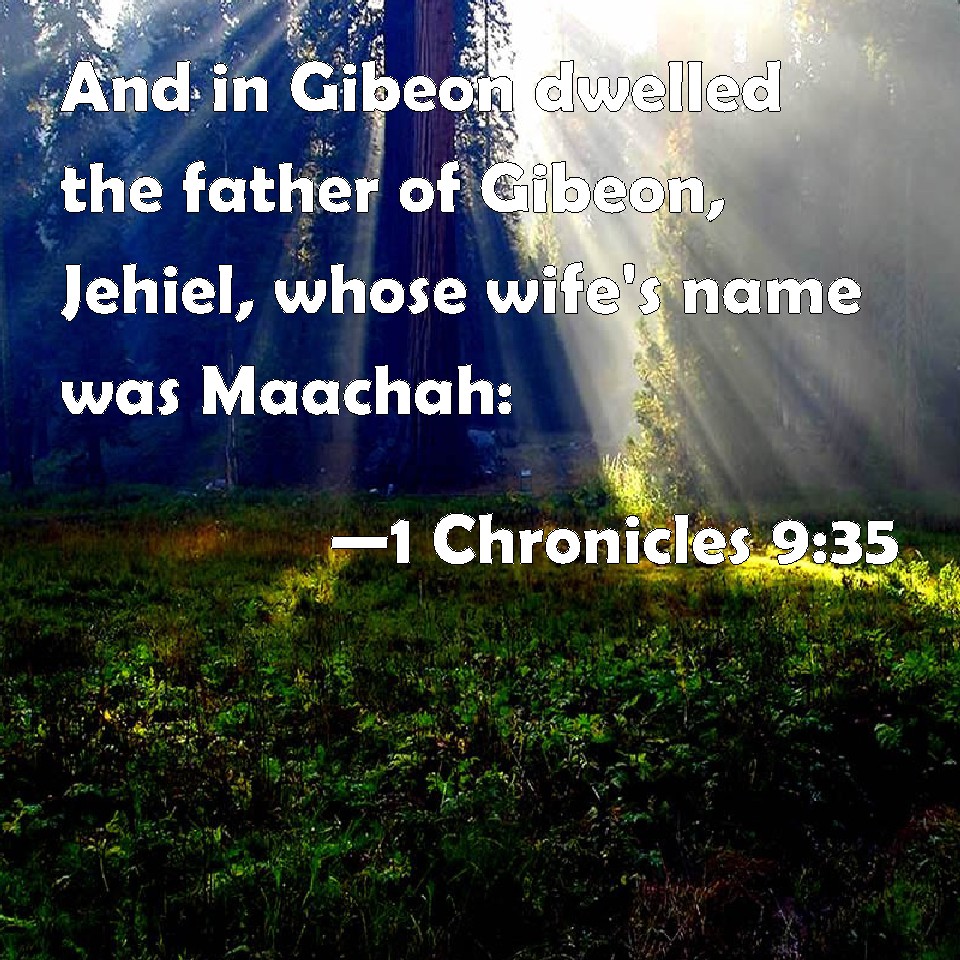 Choose a Background 1 Chronicles 9:35 And in Gibeon dwelled the father of Gibeon, Jehiel, whose wife's name was Maachah: KJV: And in Gibeon dwelt the father of Gibeon, Jehiel, whose wife's name was Maachah: DRB: And in Gabaon dwelt Jehiel the father of Gabaon, and the name of hill wife was Maacha: DBT: And at Gibeon dwelt the father of Gibeon, Jeiel, and his wife's name was Maachah. ERV: And in Gibeon there dwelt the father of Gibeon, Jeiel, whose wife's name was Maacah: WBT: And in Gibeon dwelt the father of Gibeon, Jehiel, whose wife's name was Maachah: WEB: In Gibeon there lived the father of Gibeon, Jeiel, whose wife's name was Maacah: YLT: And in Gibeon dwelt hath the father of Gibeon, Jehiel, and the name of his wife is Maachah;Links 1 Chronicles 9:35 NIV • 1 Chronicles 9:35 NLT • 1 Chronicles 9:35 ESV • 1 Chronicles 9:35 NASB • 1 Chronicles 9:35 KJV • 1 Chronicles 9:35 Interlinear • 1 Chronicles 9:35 Commentaries • 1 Chronicles 9:35 Parallel Texts • 1 Chronicles 9:35 Bible Apps • 1 Chronicles 9:35 Parallel • Bible Hub |