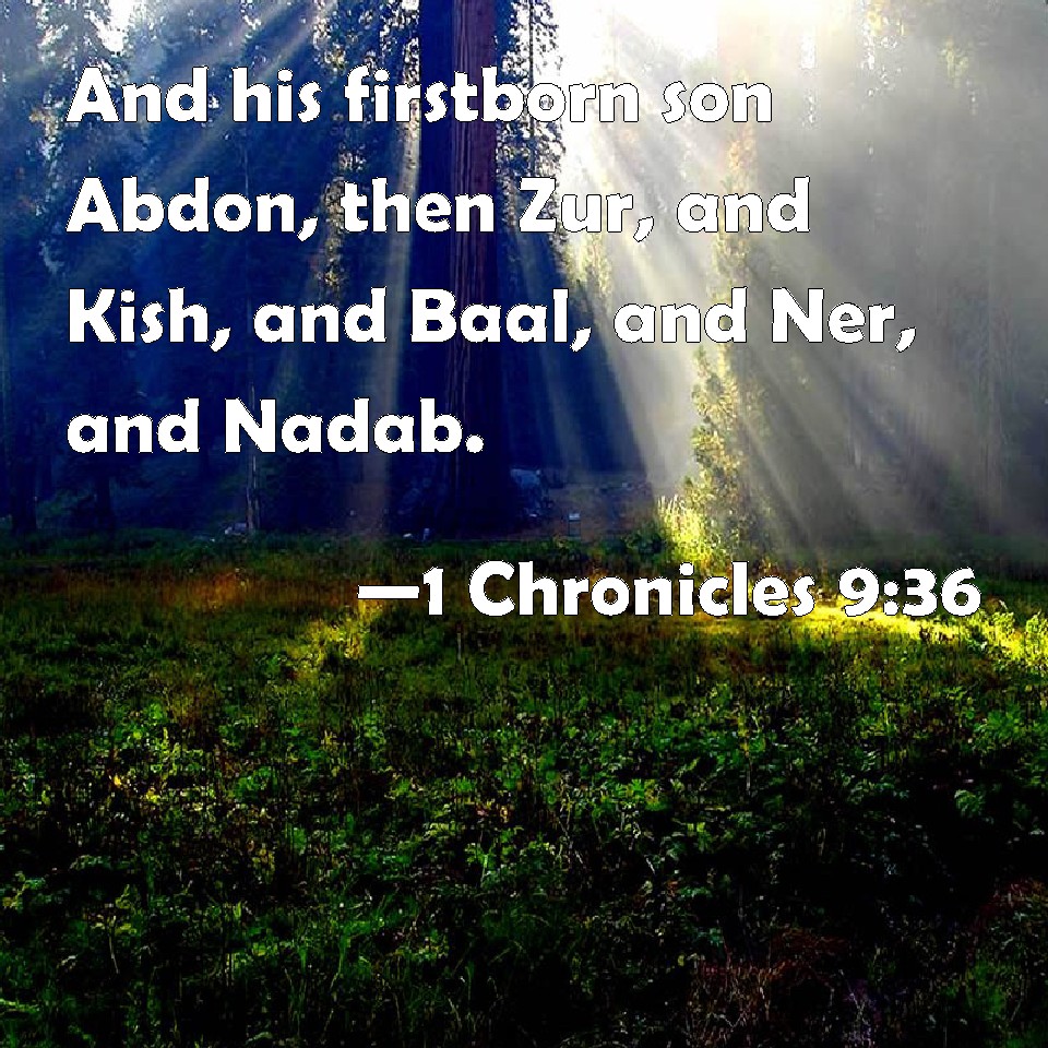 Choose a Background 1 Chronicles 9:36 And his firstborn son Abdon, then Zur, and Kish, and Baal, and Ner, and Nadab. KJV: And his firstborn son Abdon, then Zur, and Kish, and Baal, and Ner, and Nadab, DRB: His firstborn son Abdon, and Sur, and Cis, and Baal, and Ner, and Nadab, DBT: And his son, the firstborn, was Abdon, and Zur, and Kish, and Baal, and Ner, and Nadab, ERV: and his firstborn son Abdon, and Zur, and Kish, and Baal, and Ner, and Nadab; WBT: And his first-born son Abdon, then Zur, and Kish, and Baal, and Ner, and Nadab, WEB: and his firstborn son Abdon, and Zur, and Kish, and Baal, and Ner, and Nadab, YLT: and his son, the first-born, is Abdon, and Zur, and Kish, and Baal, and Ner, and Nadab,Links 1 Chronicles 9:36 NIV • 1 Chronicles 9:36 NLT • 1 Chronicles 9:36 ESV • 1 Chronicles 9:36 NASB • 1 Chronicles 9:36 KJV • 1 Chronicles 9:36 Interlinear • 1 Chronicles 9:36 Commentaries • 1 Chronicles 9:36 Parallel Texts • 1 Chronicles 9:36 Bible Apps • 1 Chronicles 9:36 Parallel • Bible Hub |