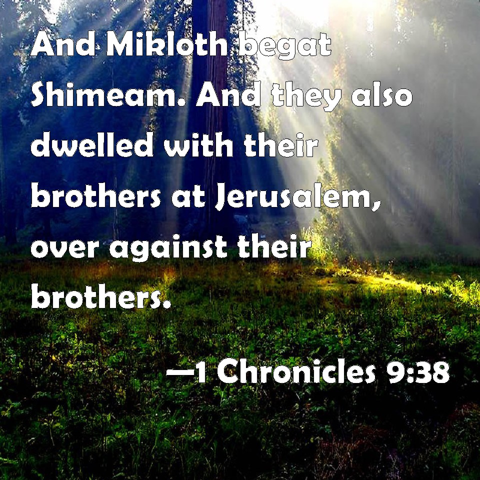 Choose a Background 1 Chronicles 9:38 And Mikloth begat Shimeam. And they also dwelled with their brothers at Jerusalem, over against their brothers. KJV: And Mikloth begat Shimeam. And they also dwelt with their brethren at Jerusalem, over against their brethren. DRB: And Macelloth beget Samaan: these dwelt over against their brethren in Jerusalem, with their brethren. DBT: and Mikloth begot Shimeam. And they also dwelt beside their brethren in Jerusalem, with their brethren. ERV: And Mikloth begat Shimeam. And they also dwelt with their brethren in Jerusalem, over against their brethren. WBT: And Mikloth begat Shimeam. And they also dwelt with their brethren at Jerusalem, over against their brethren. WEB: Mikloth became the father of Shimeam. They also lived with their brothers in Jerusalem, over against their brothers. YLT: And Mikloth begat Shimeam, and they also, over-against their brethren, have dwelt in Jerusalem with their brethren.Links 1 Chronicles 9:38 NIV • 1 Chronicles 9:38 NLT • 1 Chronicles 9:38 ESV • 1 Chronicles 9:38 NASB • 1 Chronicles 9:38 KJV • 1 Chronicles 9:38 Interlinear • 1 Chronicles 9:38 Commentaries • 1 Chronicles 9:38 Parallel Texts • 1 Chronicles 9:38 Bible Apps • 1 Chronicles 9:38 Parallel • Bible Hub |