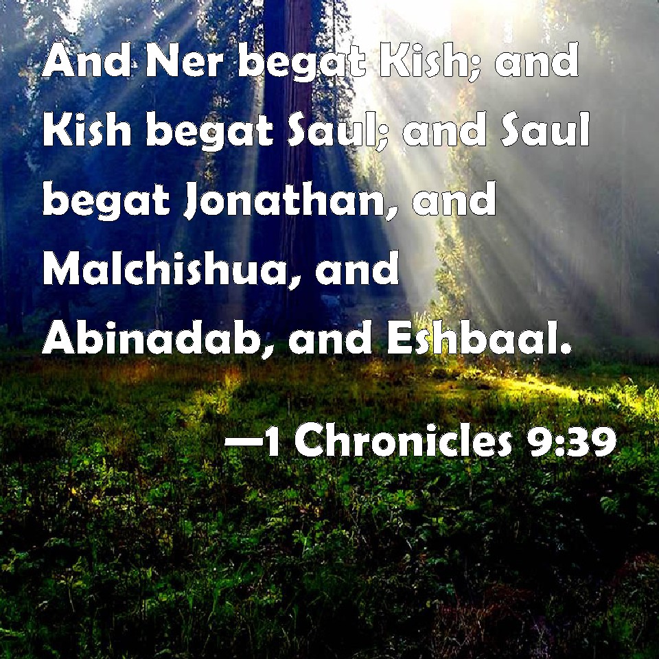 Choose a Background 1 Chronicles 9:39 And Ner begat Kish; and Kish begat Saul; and Saul begat Jonathan, and Malchishua, and Abinadab, and Eshbaal. KJV: And Ner begat Kish; and Kish begat Saul; and Saul begat Jonathan, and Malchishua, and Abinadab, and Eshbaal. DRB: Now Ner beget Cia: and Cis begot Saul: and Saul beget Jonathan and Melchisua, and Abinadab, and Esbaal. DBT: And Ner begot Kish; and Kish begot Saul; and Saul begot Jonathan, and Malchishua, and Abinadab, and Esh-baal. ERV: And Ner begat Kish; and Kish begat Saul; and Saul begat Jonathan, and Malchi-shua, and Abinadab, and Eshbaal. WBT: And Ner begat Kish; and Kish begat Saul; and Saul begat Jonathan, and Malchi-shua, and Abinadab, and Esh-baal. WEB: Ner became the father of Kish; and Kish became the father of Saul; and Saul became the father of Jonathan, and Malchishua, and Abinadab, and Eshbaal. YLT: And Ner begat Kish, and Kish begat Saul, and Saul begat Jonathan, and Malchi-Shua, and Abinadab, and Esh-Baal.Links 1 Chronicles 9:39 NIV • 1 Chronicles 9:39 NLT • 1 Chronicles 9:39 ESV • 1 Chronicles 9:39 NASB • 1 Chronicles 9:39 KJV • 1 Chronicles 9:39 Interlinear • 1 Chronicles 9:39 Commentaries • 1 Chronicles 9:39 Parallel Texts • 1 Chronicles 9:39 Bible Apps • 1 Chronicles 9:39 Parallel • Bible Hub |