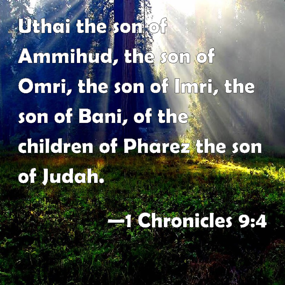 Choose a Background 1 Chronicles 9:4 Uthai the son of Ammihud, the son of Omri, the son of Imri, the son of Bani, of the children of Pharez the son of Judah. KJV: Uthai the son of Ammihud, the son of Omri, the son of Imri, the son of Bani, of the children of Pharez the son of Judah. DRB: Othei the son of Ammiud, the son of Amri, the son of Omrai, the son of Bonni, of the sons of Phares the son of Juda. DBT: Uthai the son of Ammihud, the son of Omri, the son of Imri, the son of Bani, of the children of Pherez the son of Judah. ERV: Uthai the son of Ammihud, the son of Omri, the son of Imri, the son of Bani, of the children of Perez the son of Judah. WBT: Uthai the son of Ammihud, the son of Omri, the son of Imri, the son of Bani, of the children of Pharez the son of Judah. WEB: Uthai the son of Ammihud, the son of Omri, the son of Imri, the son of Bani, of the children of Perez the son of Judah. YLT: Uthai son of Ammihud, son of Omri, son of Imri, son of Bani, of the sons of Pharez, son of Judah.Links 1 Chronicles 9:4 NIV • 1 Chronicles 9:4 NLT • 1 Chronicles 9:4 ESV • 1 Chronicles 9:4 NASB • 1 Chronicles 9:4 KJV • 1 Chronicles 9:4 Interlinear • 1 Chronicles 9:4 Commentaries • 1 Chronicles 9:4 Parallel Texts • 1 Chronicles 9:4 Bible Apps • 1 Chronicles 9:4 Parallel • Bible Hub |