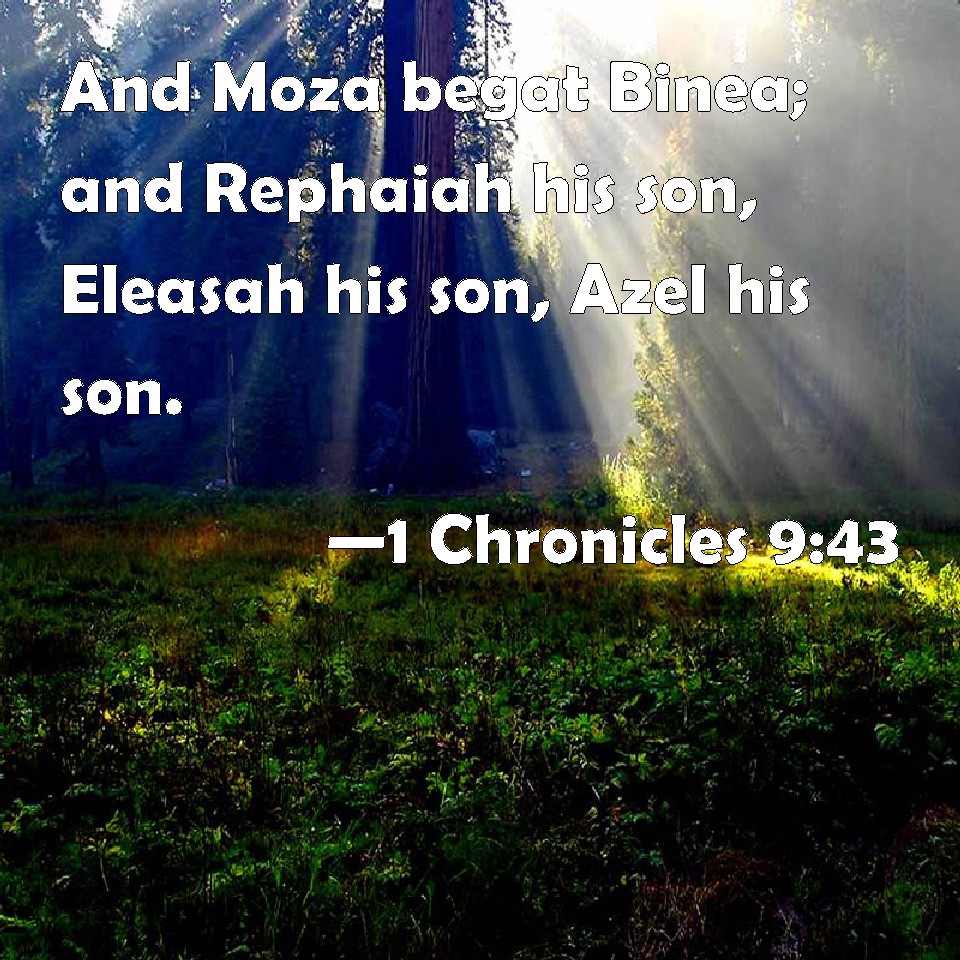 Choose a Background 1 Chronicles 9:43 And Moza begat Binea; and Rephaiah his son, Eleasah his son, Azel his son. KJV: And Moza begat Binea; and Rephaiah his son, Eleasah his son, Azel his son. DRB: And Mesa beget Banaa: whose son Raphaia beget Elasa: of whom was born Asel. DBT: and Moza begot Binea; and Rephaiah his son, Eleasah his son, Azel his son. ERV: and Moza begat Binea; and Rephaiah his son, Eleasah his son, Azel his son: WBT: And Moza begat Binea; and Rephaiah his son, Eleasah his son, Azel his son. WEB: and Moza became the father of Binea; and Rephaiah his son, Eleasah his son, Azel his son. YLT: and Moza begat Binea, and Rephaiah is his son. Eleasah his son, Azel his son.Links 1 Chronicles 9:43 NIV • 1 Chronicles 9:43 NLT • 1 Chronicles 9:43 ESV • 1 Chronicles 9:43 NASB • 1 Chronicles 9:43 KJV • 1 Chronicles 9:43 Interlinear • 1 Chronicles 9:43 Commentaries • 1 Chronicles 9:43 Parallel Texts • 1 Chronicles 9:43 Bible Apps • 1 Chronicles 9:43 Parallel • Bible Hub |