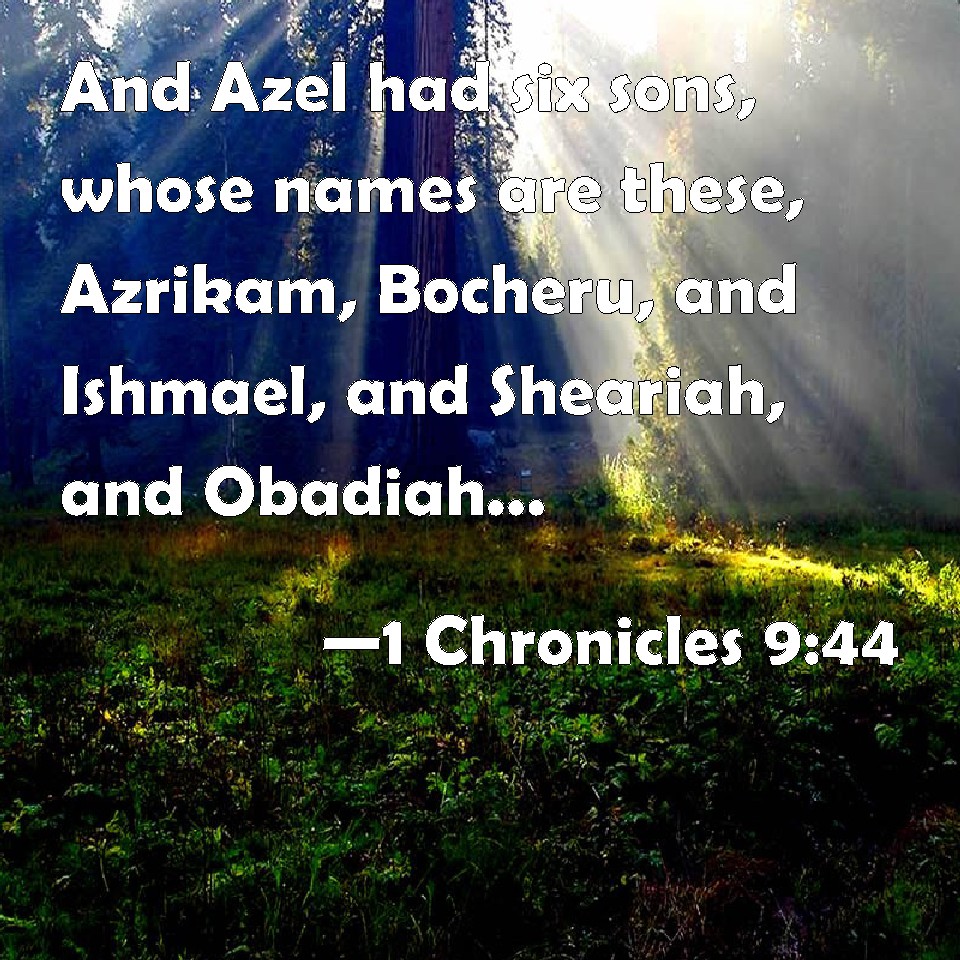 Choose a Background 1 Chronicles 9:44 And Azel had six sons, whose names are these, Azrikam, Bocheru, and Ishmael, and Sheariah, and Obadiah, and Hanan: these were the sons of Azel. KJV: And Azel had six sons, whose names are these, Azrikam, Bocheru, and Ishmael, and Sheariah, and Obadiah, and Hanan: these were the sons of Azel. DRB: And heel had six sons whose names are, Ezricam, Bochru, Ismahel, Saria, Obdia, Hanan: these are the sons of Asel. DBT: And Azel had six sons, and these are their names: Azrikam, Bochru, and Ishmael, and Sheariah, and Obadiah, and Hanan; these were the sons of Azel. ERV: And Azel had six sons, whose names are these; Azrikam, Bocheru, and Ishmael, and Sheariah, and Obadiah, and Hanan: these were the sons of Azel. WBT: And Azel had six sons, whose names are these, Azrikam, Bocheru, and Ishmael, and Sheariah, and Obadiah, and Hanan: these were the sons of Azel. WEB: Azel had six sons, whose names are these: Azrikam, Bocheru, and Ishmael, and Sheariah, and Obadiah, and Hanan: these were the sons of Azel. YLT: And to Azel are six sons, and these their names: Azrikam, Bocheru, and Ishmael, and Sheariah, and Obadiah, and Hanan: these are sons of Azel.Links 1 Chronicles 9:44 NIV • 1 Chronicles 9:44 NLT • 1 Chronicles 9:44 ESV • 1 Chronicles 9:44 NASB • 1 Chronicles 9:44 KJV • 1 Chronicles 9:44 Interlinear • 1 Chronicles 9:44 Commentaries • 1 Chronicles 9:44 Parallel Texts • 1 Chronicles 9:44 Bible Apps • 1 Chronicles 9:44 Parallel • Bible Hub |