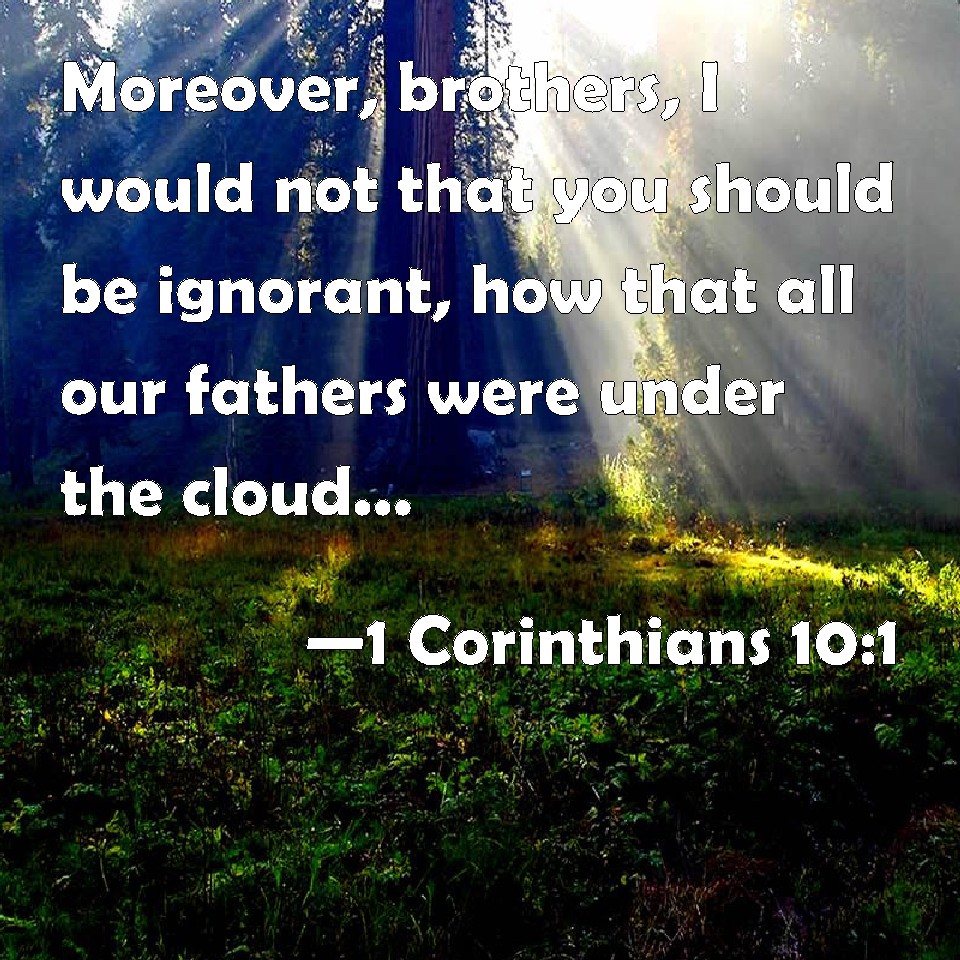 Choose a Background 1 Corinthians 10:1 Moreover, brothers, I would not that you should be ignorant, how that all our fathers were under the cloud, and all passed through the sea; KJV: Moreover, brethren, I would not that ye should be ignorant, how that all our fathers were under the cloud, and all passed through the sea; DRB: FOR I would not have you ignorant, brethren, that our fathers were all under the cloud, and all passed through the sea. DBT: For I would not have you ignorant, brethren, that all our fathers were under the cloud, and all passed through the sea; ERV: For I would not, brethren, have you ignorant, how that our fathers were all under the cloud, and all passed through the sea; WBT: Moreover, brethren, I would not that ye should be ignorant, that all our fathers were under the cloud, and all passed through the sea; WEB: Now I would not have you ignorant, brothers, that our fathers were all under the cloud, and all passed through the sea; YLT: And I do not wish you to be ignorant, brethren, that all our fathers were under the cloud, and all passed through the sea,Links 1 Corinthians 10:1 NIV • 1 Corinthians 10:1 NLT • 1 Corinthians 10:1 ESV • 1 Corinthians 10:1 NASB • 1 Corinthians 10:1 KJV • 1 Corinthians 10:1 Interlinear • 1 Corinthians 10:1 Commentaries • 1 Corinthians 10:1 Parallel Texts • 1 Corinthians 10:1 Bible Apps • 1 Corinthians 10:1 Parallel • Bible Hub |