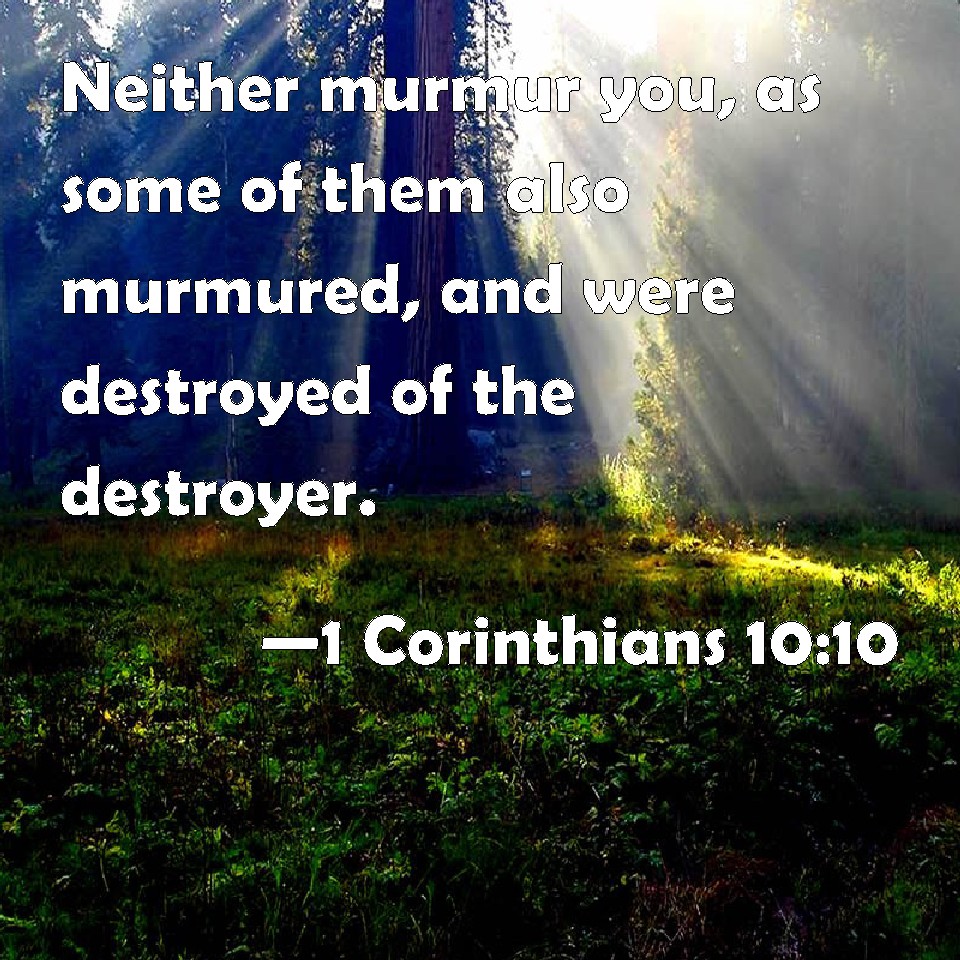 Choose a Background 1 Corinthians 10:10 Neither murmur you, as some of them also murmured, and were destroyed of the destroyer. KJV: Neither murmur ye, as some of them also murmured, and were destroyed of the destroyer. DRB: Neither do you murmur: as some of them murmured, and were destroyed by the destroyer. DBT: Neither murmur ye, as some of them murmured, and perished by the destroyer. ERV: Neither murmur ye, as some of them murmured, and perished by the destroyer. WBT: Neither murmur ye, as some of them also murmured, and were destroyed by the destroyer. WEB: Neither grumble, as some of them also grumbled, and perished by the destroyer. YLT: neither murmur ye, as also some of them did murmur, and did perish by the destroyer.Links 1 Corinthians 10:10 NIV • 1 Corinthians 10:10 NLT • 1 Corinthians 10:10 ESV • 1 Corinthians 10:10 NASB • 1 Corinthians 10:10 KJV • 1 Corinthians 10:10 Interlinear • 1 Corinthians 10:10 Commentaries • 1 Corinthians 10:10 Parallel Texts • 1 Corinthians 10:10 Bible Apps • 1 Corinthians 10:10 Parallel • Bible Hub |